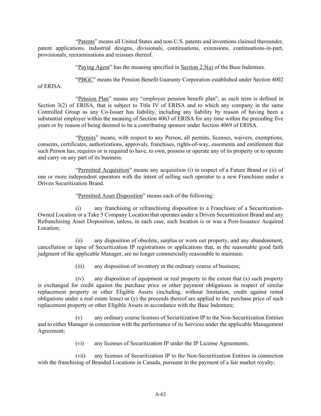 A-62 “Patents” means all United States and non-U.S. patents and inventions claimed thereunder, patent applications, industrial designs, divisionals, continuations, extensions, continuations-in-part, provisionals, reexaminations and reissues thereof. “Paying Agent” has the meaning specified in Section 2.5(a) of the Base Indenture. “PBGC” means the Pension Benefit Guaranty Corporation established under Section 4002 of ERISA. “Pension Plan” means any “employee pension benefit plan”, as such term is defined in Section 3(2) of ERISA, that is subject to Title IV of ERISA and to which any company in the same Controlled Group as any Co-Issuer has liability, including any liability by reason of having been a substantial employer within the meaning of Section 4063 of ERISA for any time within the preceding five years or by reason of being deemed to be a contributing sponsor under Section 4069 of ERISA. “Permits” means, with respect to any Person, all permits, licenses, waivers, exemptions, consents, certificates, authorizations, approvals, franchises, rights-of-way, easements and entitlement that such Person has, requires or is required to have, to own, possess or operate any of its property or to operate and carry on any part of its business. “Permitted Acquisition” means any acquisition (i) in respect of a Future Brand or (ii) of one or more independent operators with the intent of selling such operator to a new Franchisee under a Driven Securitization Brand. “Permitted Asset Disposition” means each of the following: (i) any franchising or refranchising disposition to a Franchisee of a Securitization- Owned Location or a Take 5 Company Location that operates under a Driven Securitization Brand and any Refranchising Asset Disposition, unless, in each case, such location is or was a Post-Issuance Acquired Location; (ii) any disposition of obsolete, surplus or worn out property, and any abandonment, cancellation or lapse of Securitization IP registrations or applications that, in the reasonable good faith judgment of the applicable Manager, are no longer commercially reasonable to maintain; (iii) any disposition of inventory in the ordinary course of business; (iv) any disposition of equipment or real property to the extent that (x) such property is exchanged for credit against the purchase price or other payment obligations in respect of similar replacement property or other Eligible Assets (including, without limitation, credit against rental obligations under a real estate lease) or (y) the proceeds thereof are applied to the purchase price of such replacement property or other Eligible Assets in accordance with the Base Indenture; (v) any ordinary course licenses of Securitization IP to the Non-Securitization Entities and to either Manager in connection with the performance of its Services under the applicable Management Agreement; (vi) any licenses of Securitization IP under the IP License Agreements; (vii) any licenses of Securitization IP to the Non-Securitization Entities in connection with the franchising of Branded Locations in Canada, pursuant to the payment of a fair market royalty;