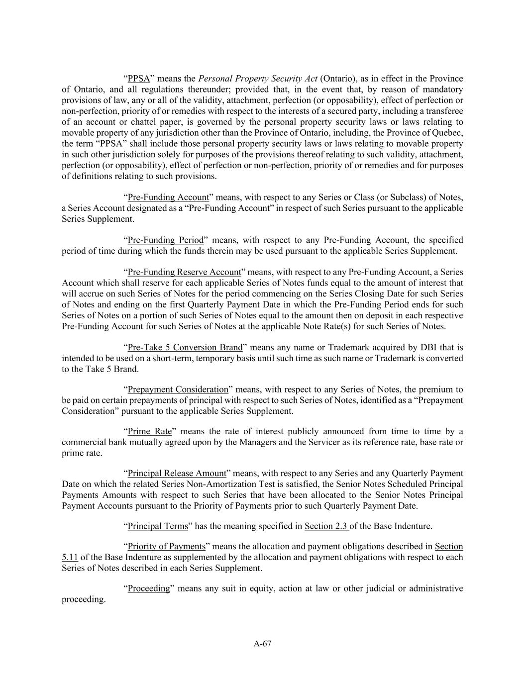 A-67 “PPSA” means the Personal Property Security Act (Ontario), as in effect in the Province of Ontario, and all regulations thereunder; provided that, in the event that, by reason of mandatory provisions of law, any or all of the validity, attachment, perfection (or opposability), effect of perfection or non-perfection, priority of or remedies with respect to the interests of a secured party, including a transferee of an account or chattel paper, is governed by the personal property security laws or laws relating to movable property of any jurisdiction other than the Province of Ontario, including, the Province of Quebec, the term “PPSA” shall include those personal property security laws or laws relating to movable property in such other jurisdiction solely for purposes of the provisions thereof relating to such validity, attachment, perfection (or opposability), effect of perfection or non-perfection, priority of or remedies and for purposes of definitions relating to such provisions. “Pre-Funding Account” means, with respect to any Series or Class (or Subclass) of Notes, a Series Account designated as a “Pre-Funding Account” in respect of such Series pursuant to the applicable Series Supplement. “Pre-Funding Period” means, with respect to any Pre-Funding Account, the specified period of time during which the funds therein may be used pursuant to the applicable Series Supplement. “Pre-Funding Reserve Account” means, with respect to any Pre-Funding Account, a Series Account which shall reserve for each applicable Series of Notes funds equal to the amount of interest that will accrue on such Series of Notes for the period commencing on the Series Closing Date for such Series of Notes and ending on the first Quarterly Payment Date in which the Pre-Funding Period ends for such Series of Notes on a portion of such Series of Notes equal to the amount then on deposit in each respective Pre-Funding Account for such Series of Notes at the applicable Note Rate(s) for such Series of Notes. “Pre-Take 5 Conversion Brand” means any name or Trademark acquired by DBI that is intended to be used on a short-term, temporary basis until such time as such name or Trademark is converted to the Take 5 Brand. “Prepayment Consideration” means, with respect to any Series of Notes, the premium to be paid on certain prepayments of principal with respect to such Series of Notes, identified as a “Prepayment Consideration” pursuant to the applicable Series Supplement. “Prime Rate” means the rate of interest publicly announced from time to time by a commercial bank mutually agreed upon by the Managers and the Servicer as its reference rate, base rate or prime rate. “Principal Release Amount” means, with respect to any Series and any Quarterly Payment Date on which the related Series Non-Amortization Test is satisfied, the Senior Notes Scheduled Principal Payments Amounts with respect to such Series that have been allocated to the Senior Notes Principal Payment Accounts pursuant to the Priority of Payments prior to such Quarterly Payment Date. “Principal Terms” has the meaning specified in Section 2.3 of the Base Indenture. “Priority of Payments” means the allocation and payment obligations described in Section 5.11 of the Base Indenture as supplemented by the allocation and payment obligations with respect to each Series of Notes described in each Series Supplement. “Proceeding” means any suit in equity, action at law or other judicial or administrative proceeding.