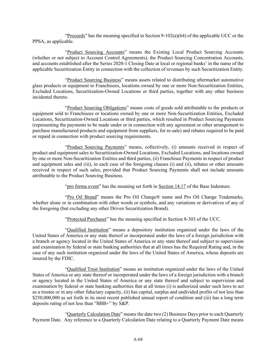 A-68 “Proceeds” has the meaning specified in Section 9-102(a)(64) of the applicable UCC or the PPSA, as applicable. “Product Sourcing Accounts” means the Existing Local Product Sourcing Accounts (whether or not subject to Account Control Agreements), the Product Sourcing Concentration Accounts, and accounts established after the Series 2020-1 Closing Date at local or regional banks’ in the name of the applicable Securitization Entity in connection with the collection of revenues by such Securitization Entity. “Product Sourcing Business” means assets related to distributing aftermarket automotive glass products or equipment to Franchisees, locations owned by one or more Non-Securitization Entities, Excluded Locations, Securitization-Owned Locations or third parties, together with any other business incidental thereto. “Product Sourcing Obligations” means costs of goods sold attributable to the products or equipment sold to Franchisees or locations owned by one or more Non-Securitization Entities, Excluded Locations, Securitization-Owned Locations or third parties, which resulted in Product Sourcing Payments (representing the payments to be made under or in connection with any agreement or other arrangement to purchase manufactured products and equipment from suppliers, for re-sale) and rebates required to be paid or repaid in connection with product sourcing requirements. “Product Sourcing Payments” means, collectively, (i) amounts received in respect of product and equipment sales to Securitization-Owned Locations, Excluded Locations, and locations owned by one or more Non-Securitization Entities and third parties, (ii) Franchisee Payments in respect of product and equipment sales and (iii), in each case of the foregoing clauses (i) and (ii), rebates or other amounts received in respect of such sales, provided that Product Sourcing Payments shall not include amounts attributable to the Product Sourcing Business. “pro forma event” has the meaning set forth in Section 14.17 of the Base Indenture. “Pro Oil Brand” means the Pro Oil Change® name and Pro Oil Change Trademarks, whether alone or in combination with other words or symbols, and any variations or derivatives of any of the foregoing (but excluding any other Driven Securitization Brand). “Protected Purchaser” has the meaning specified in Section 8-303 of the UCC. “Qualified Institution” means a depository institution organized under the laws of the United States of America or any state thereof or incorporated under the laws of a foreign jurisdiction with a branch or agency located in the United States of America or any state thereof and subject to supervision and examination by federal or state banking authorities that at all times has the Required Rating and, in the case of any such institution organized under the laws of the United States of America, whose deposits are insured by the FDIC. “Qualified Trust Institution” means an institution organized under the laws of the United States of America or any state thereof or incorporated under the laws of a foreign jurisdiction with a branch or agency located in the United States of America or any state thereof and subject to supervision and examination by federal or state banking authorities that at all times (i) is authorized under such laws to act as a trustee or in any other fiduciary capacity, (ii) has capital, surplus and undivided profits of not less than $250,000,000 as set forth in its most recent published annual report of condition and (iii) has a long term deposits rating of not less than “BBB+” by S&P. “Quarterly Calculation Date” means the date two (2) Business Days prior to each Quarterly Payment Date. Any reference to a Quarterly Calculation Date relating to a Quarterly Payment Date means