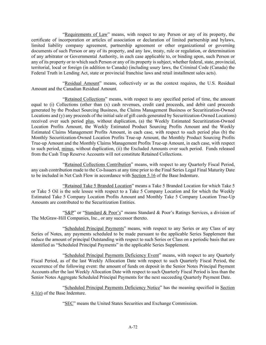 A-72 “Requirements of Law” means, with respect to any Person or any of its property, the certificate of incorporation or articles of association or declaration of limited partnership and bylaws, limited liability company agreement, partnership agreement or other organizational or governing documents of such Person or any of its property, and any law, treaty, rule or regulation, or determination of any arbitrator or Governmental Authority, in each case applicable to, or binding upon, such Person or any of its property or to which such Person or any of its property is subject, whether federal, state, provincial, territorial, local or foreign (in addition to Canada) (including usury laws, the Criminal Code (Canada) the Federal Truth in Lending Act, state or provincial franchise laws and retail installment sales acts). “Residual Amount” means, collectively or as the context requires, the U.S. Residual Amount and the Canadian Residual Amount. “Retained Collections” means, with respect to any specified period of time, the amount equal to (i) Collections (other than (x) cash revenues, credit card proceeds, and debit card proceeds generated by the Product Sourcing Business, the Claims Management Business or Securitization-Owned Locations and (y) any proceeds of the initial sale of gift cards generated by Securitization-Owned Locations) received over such period plus, without duplication, (a) the Weekly Estimated Securitization-Owned Location Profits Amount, the Weekly Estimated Product Sourcing Profits Amount and the Weekly Estimated Claims Management Profits Amount, in each case, with respect to such period plus (b) the Monthly Securitization-Owned Location Profits True-up Amount, the Monthly Product Sourcing Profits True-up Amount and the Monthly Claims Management Profits True-up Amount, in each case, with respect to such period, minus, without duplication, (ii) the Excluded Amounts over such period. Funds released from the Cash Trap Reserve Accounts will not constitute Retained Collections. “Retained Collections Contribution” means, with respect to any Quarterly Fiscal Period, any cash contribution made to the Co-Issuers at any time prior to the Final Series Legal Final Maturity Date to be included in Net Cash Flow in accordance with Section 5.16 of the Base Indenture. “Retained Take 5 Branded Location” means a Take 5 Branded Location for which Take 5 or Take 5 Oil is the sole lessee with respect to a Take 5 Company Location and for which the Weekly Estimated Take 5 Company Location Profits Amount and Monthly Take 5 Company Location True-Up Amounts are contributed to the Securitization Entities. “S&P” or “Standard & Poor’s” means Standard & Poor’s Ratings Services, a division of The McGraw-Hill Companies, Inc., or any successor thereto. “Scheduled Principal Payments” means, with respect to any Series or any Class of any Series of Notes, any payments scheduled to be made pursuant to the applicable Series Supplement that reduce the amount of principal Outstanding with respect to such Series or Class on a periodic basis that are identified as “Scheduled Principal Payments” in the applicable Series Supplement. “Scheduled Principal Payments Deficiency Event” means, with respect to any Quarterly Fiscal Period, as of the last Weekly Allocation Date with respect to such Quarterly Fiscal Period, the occurrence of the following event: the amount of funds on deposit in the Senior Notes Principal Payment Accounts after the last Weekly Allocation Date with respect to such Quarterly Fiscal Period is less than the Senior Notes Aggregate Scheduled Principal Payments for the next succeeding Quarterly Payment Date. “Scheduled Principal Payments Deficiency Notice” has the meaning specified in Section 4.1(e) of the Base Indenture. “SEC” means the United States Securities and Exchange Commission.