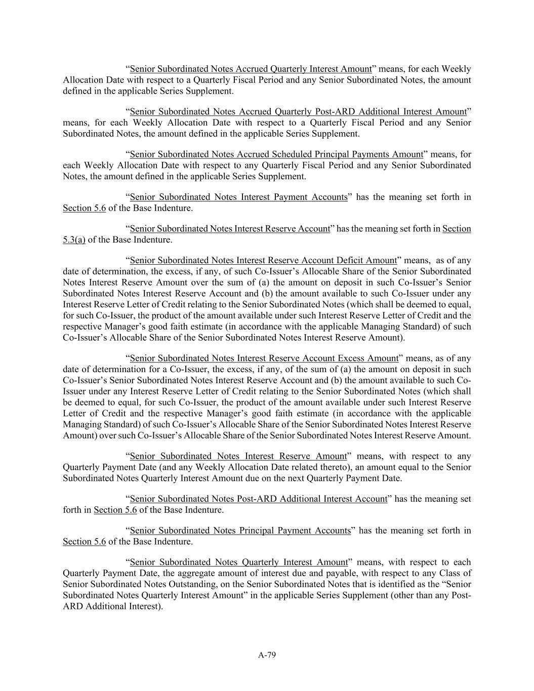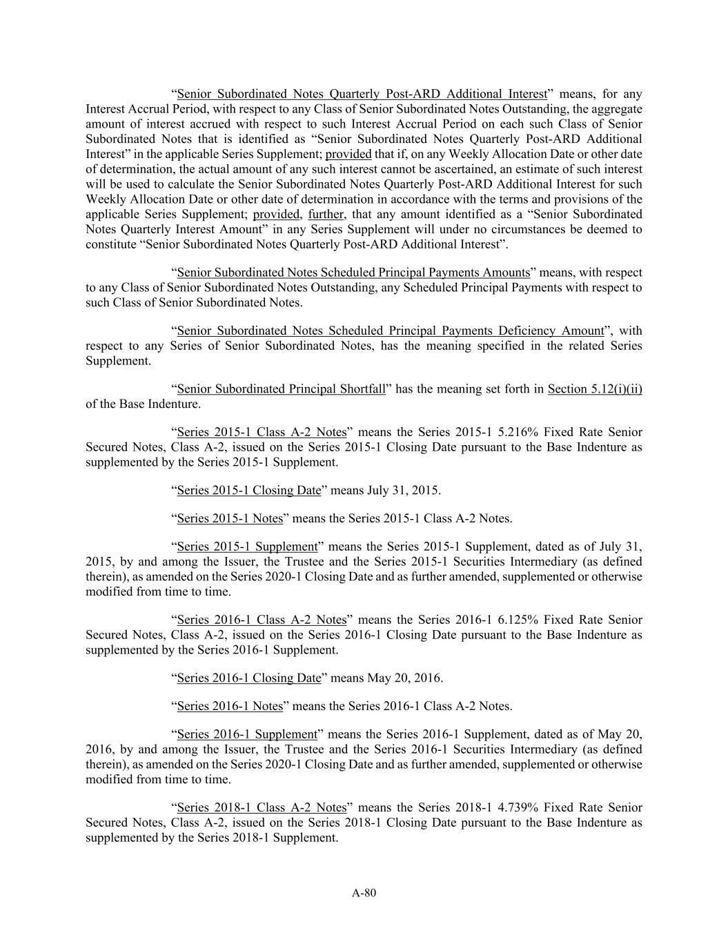 A-80 “Senior Subordinated Notes Quarterly Post-ARD Additional Interest” means, for any Interest Accrual Period, with respect to any Class of Senior Subordinated Notes Outstanding, the aggregate amount of interest accrued with respect to such Interest Accrual Period on each such Class of Senior Subordinated Notes that is identified as “Senior Subordinated Notes Quarterly Post-ARD Additional Interest” in the applicable Series Supplement; provided that if, on any Weekly Allocation Date or other date of determination, the actual amount of any such interest cannot be ascertained, an estimate of such interest will be used to calculate the Senior Subordinated Notes Quarterly Post-ARD Additional Interest for such Weekly Allocation Date or other date of determination in accordance with the terms and provisions of the applicable Series Supplement; provided, further, that any amount identified as a “Senior Subordinated Notes Quarterly Interest Amount” in any Series Supplement will under no circumstances be deemed to constitute “Senior Subordinated Notes Quarterly Post-ARD Additional Interest”. “Senior Subordinated Notes Scheduled Principal Payments Amounts” means, with respect to any Class of Senior Subordinated Notes Outstanding, any Scheduled Principal Payments with respect to such Class of Senior Subordinated Notes. “Senior Subordinated Notes Scheduled Principal Payments Deficiency Amount”, with respect to any Series of Senior Subordinated Notes, has the meaning specified in the related Series Supplement. “Senior Subordinated Principal Shortfall” has the meaning set forth in Section 5.12(i)(ii) of the Base Indenture. “Series 2015-1 Class A-2 Notes” means the Series 2015-1 5.216% Fixed Rate Senior Secured Notes, Class A-2, issued on the Series 2015-1 Closing Date pursuant to the Base Indenture as supplemented by the Series 2015-1 Supplement. “Series 2015-1 Closing Date” means July 31, 2015. “Series 2015-1 Notes” means the Series 2015-1 Class A-2 Notes. “Series 2015-1 Supplement” means the Series 2015-1 Supplement, dated as of July 31, 2015, by and among the Issuer, the Trustee and the Series 2015-1 Securities Intermediary (as defined therein), as amended on the Series 2020-1 Closing Date and as further amended, supplemented or otherwise modified from time to time. “Series 2016-1 Class A-2 Notes” means the Series 2016-1 6.125% Fixed Rate Senior Secured Notes, Class A-2, issued on the Series 2016-1 Closing Date pursuant to the Base Indenture as supplemented by the Series 2016-1 Supplement. “Series 2016-1 Closing Date” means May 20, 2016. “Series 2016-1 Notes” means the Series 2016-1 Class A-2 Notes. “Series 2016-1 Supplement” means the Series 2016-1 Supplement, dated as of May 20, 2016, by and among the Issuer, the Trustee and the Series 2016-1 Securities Intermediary (as defined therein), as amended on the Series 2020-1 Closing Date and as further amended, supplemented or otherwise modified from time to time. “Series 2018-1 Class A-2 Notes” means the Series 2018-1 4.739% Fixed Rate Senior Secured Notes, Class A-2, issued on the Series 2018-1 Closing Date pursuant to the Base Indenture as supplemented by the Series 2018-1 Supplement.