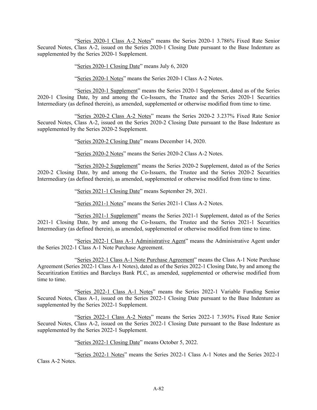 A-82 “Series 2020-1 Class A-2 Notes” means the Series 2020-1 3.786% Fixed Rate Senior Secured Notes, Class A-2, issued on the Series 2020-1 Closing Date pursuant to the Base Indenture as supplemented by the Series 2020-1 Supplement. “Series 2020-1 Closing Date” means July 6, 2020 “Series 2020-1 Notes” means the Series 2020-1 Class A-2 Notes. “Series 2020-1 Supplement” means the Series 2020-1 Supplement, dated as of the Series 2020-1 Closing Date, by and among the Co-Issuers, the Trustee and the Series 2020-1 Securities Intermediary (as defined therein), as amended, supplemented or otherwise modified from time to time. “Series 2020-2 Class A-2 Notes” means the Series 2020-2 3.237% Fixed Rate Senior Secured Notes, Class A-2, issued on the Series 2020-2 Closing Date pursuant to the Base Indenture as supplemented by the Series 2020-2 Supplement. “Series 2020-2 Closing Date” means December 14, 2020. “Series 2020-2 Notes” means the Series 2020-2 Class A-2 Notes. “Series 2020-2 Supplement” means the Series 2020-2 Supplement, dated as of the Series 2020-2 Closing Date, by and among the Co-Issuers, the Trustee and the Series 2020-2 Securities Intermediary (as defined therein), as amended, supplemented or otherwise modified from time to time. “Series 2021-1 Closing Date” means September 29, 2021. “Series 2021-1 Notes” means the Series 2021-1 Class A-2 Notes. “Series 2021-1 Supplement” means the Series 2021-1 Supplement, dated as of the Series 2021-1 Closing Date, by and among the Co-Issuers, the Trustee and the Series 2021-1 Securities Intermediary (as defined therein), as amended, supplemented or otherwise modified from time to time. “Series 2022-1 Class A-1 Administrative Agent” means the Administrative Agent under the Series 2022-1 Class A-1 Note Purchase Agreement. “Series 2022-1 Class A-1 Note Purchase Agreement” means the Class A-1 Note Purchase Agreement (Series 2022-1 Class A-1 Notes), dated as of the Series 2022-1 Closing Date, by and among the Securitization Entities and Barclays Bank PLC, as amended, supplemented or otherwise modified from time to time. “Series 2022-1 Class A-1 Notes” means the Series 2022-1 Variable Funding Senior Secured Notes, Class A-1, issued on the Series 2022-1 Closing Date pursuant to the Base Indenture as supplemented by the Series 2022-1 Supplement. “Series 2022-1 Class A-2 Notes” means the Series 2022-1 7.393% Fixed Rate Senior Secured Notes, Class A-2, issued on the Series 2022-1 Closing Date pursuant to the Base Indenture as supplemented by the Series 2022-1 Supplement. “Series 2022-1 Closing Date” means October 5, 2022. “Series 2022-1 Notes” means the Series 2022-1 Class A-1 Notes and the Series 2022-1 Class A-2 Notes.