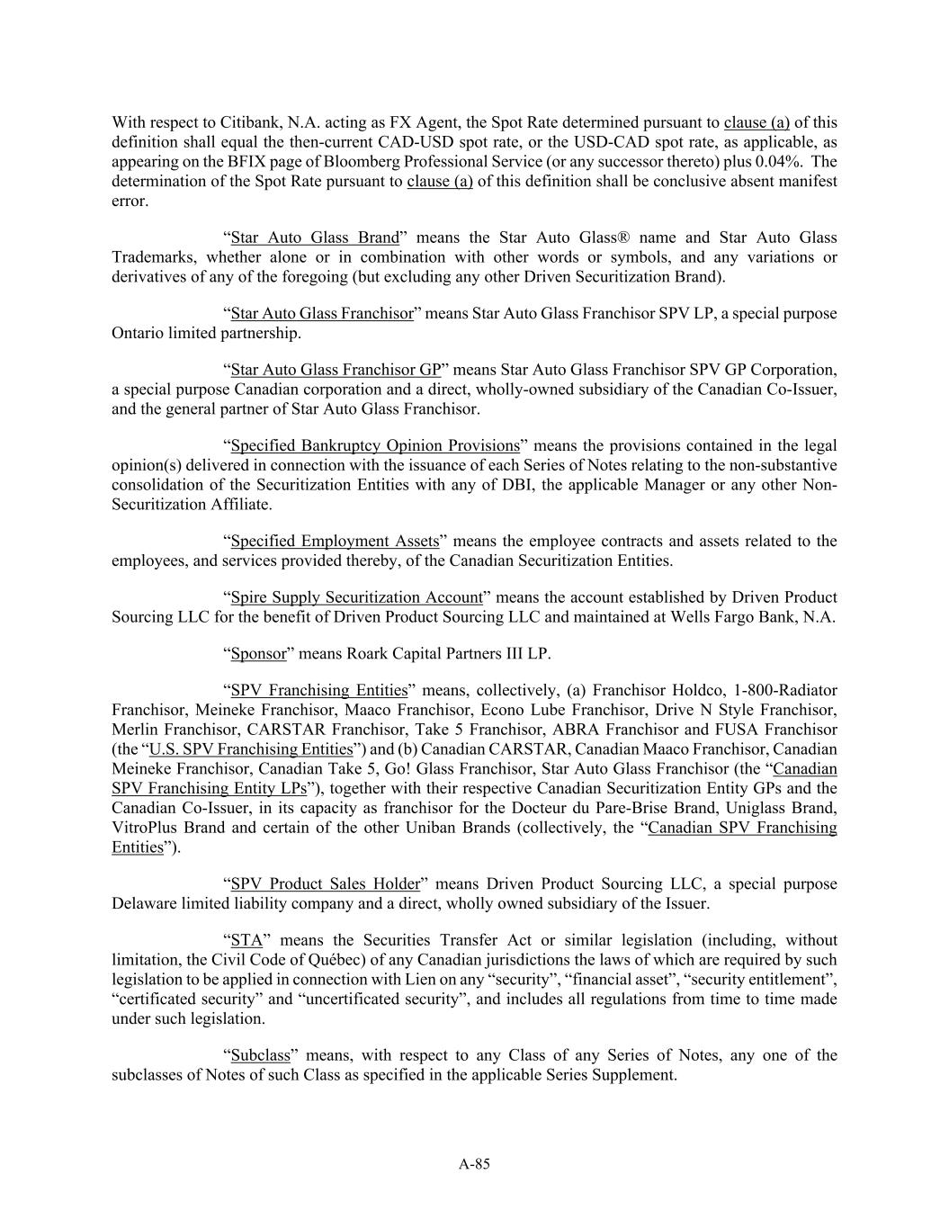 A-85 With respect to Citibank, N.A. acting as FX Agent, the Spot Rate determined pursuant to clause (a) of this definition shall equal the then-current CAD-USD spot rate, or the USD-CAD spot rate, as applicable, as appearing on the BFIX page of Bloomberg Professional Service (or any successor thereto) plus 0.04%. The determination of the Spot Rate pursuant to clause (a) of this definition shall be conclusive absent manifest error. “Star Auto Glass Brand” means the Star Auto Glass® name and Star Auto Glass Trademarks, whether alone or in combination with other words or symbols, and any variations or derivatives of any of the foregoing (but excluding any other Driven Securitization Brand). “Star Auto Glass Franchisor” means Star Auto Glass Franchisor SPV LP, a special purpose Ontario limited partnership. “Star Auto Glass Franchisor GP” means Star Auto Glass Franchisor SPV GP Corporation, a special purpose Canadian corporation and a direct, wholly-owned subsidiary of the Canadian Co-Issuer, and the general partner of Star Auto Glass Franchisor. “Specified Bankruptcy Opinion Provisions” means the provisions contained in the legal opinion(s) delivered in connection with the issuance of each Series of Notes relating to the non-substantive consolidation of the Securitization Entities with any of DBI, the applicable Manager or any other Non- Securitization Affiliate. “Specified Employment Assets” means the employee contracts and assets related to the employees, and services provided thereby, of the Canadian Securitization Entities. “Spire Supply Securitization Account” means the account established by Driven Product Sourcing LLC for the benefit of Driven Product Sourcing LLC and maintained at Wells Fargo Bank, N.A. “Sponsor” means Roark Capital Partners III LP. “SPV Franchising Entities” means, collectively, (a) Franchisor Holdco, 1-800-Radiator Franchisor, Meineke Franchisor, Maaco Franchisor, Econo Lube Franchisor, Drive N Style Franchisor, Merlin Franchisor, CARSTAR Franchisor, Take 5 Franchisor, ABRA Franchisor and FUSA Franchisor (the “U.S. SPV Franchising Entities”) and (b) Canadian CARSTAR, Canadian Maaco Franchisor, Canadian Meineke Franchisor, Canadian Take 5, Go! Glass Franchisor, Star Auto Glass Franchisor (the “Canadian SPV Franchising Entity LPs”), together with their respective Canadian Securitization Entity GPs and the Canadian Co-Issuer, in its capacity as franchisor for the Docteur du Pare-Brise Brand, Uniglass Brand, VitroPlus Brand and certain of the other Uniban Brands (collectively, the “Canadian SPV Franchising Entities”). “SPV Product Sales Holder” means Driven Product Sourcing LLC, a special purpose Delaware limited liability company and a direct, wholly owned subsidiary of the Issuer. “STA” means the Securities Transfer Act or similar legislation (including, without limitation, the Civil Code of Québec) of any Canadian jurisdictions the laws of which are required by such legislation to be applied in connection with Lien on any “security”, “financial asset”, “security entitlement”, “certificated security” and “uncertificated security”, and includes all regulations from time to time made under such legislation. “Subclass” means, with respect to any Class of any Series of Notes, any one of the subclasses of Notes of such Class as specified in the applicable Series Supplement.