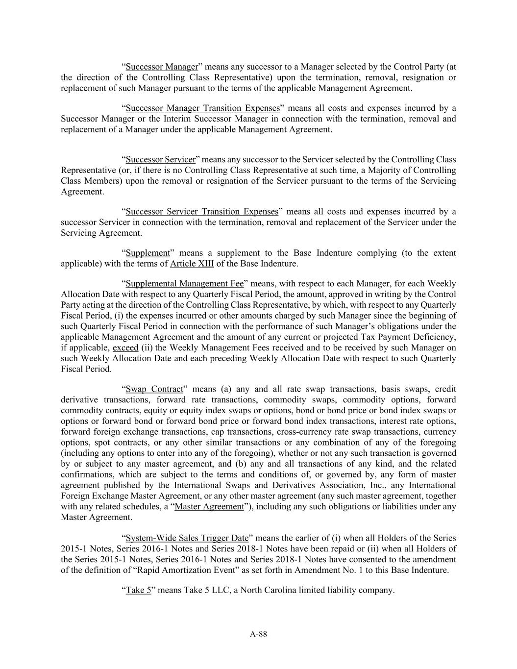 A-88 “Successor Manager” means any successor to a Manager selected by the Control Party (at the direction of the Controlling Class Representative) upon the termination, removal, resignation or replacement of such Manager pursuant to the terms of the applicable Management Agreement. “Successor Manager Transition Expenses” means all costs and expenses incurred by a Successor Manager or the Interim Successor Manager in connection with the termination, removal and replacement of a Manager under the applicable Management Agreement. “Successor Servicer” means any successor to the Servicer selected by the Controlling Class Representative (or, if there is no Controlling Class Representative at such time, a Majority of Controlling Class Members) upon the removal or resignation of the Servicer pursuant to the terms of the Servicing Agreement. “Successor Servicer Transition Expenses” means all costs and expenses incurred by a successor Servicer in connection with the termination, removal and replacement of the Servicer under the Servicing Agreement. “Supplement” means a supplement to the Base Indenture complying (to the extent applicable) with the terms of Article XIII of the Base Indenture. “Supplemental Management Fee” means, with respect to each Manager, for each Weekly Allocation Date with respect to any Quarterly Fiscal Period, the amount, approved in writing by the Control Party acting at the direction of the Controlling Class Representative, by which, with respect to any Quarterly Fiscal Period, (i) the expenses incurred or other amounts charged by such Manager since the beginning of such Quarterly Fiscal Period in connection with the performance of such Manager’s obligations under the applicable Management Agreement and the amount of any current or projected Tax Payment Deficiency, if applicable, exceed (ii) the Weekly Management Fees received and to be received by such Manager on such Weekly Allocation Date and each preceding Weekly Allocation Date with respect to such Quarterly Fiscal Period. “Swap Contract” means (a) any and all rate swap transactions, basis swaps, credit derivative transactions, forward rate transactions, commodity swaps, commodity options, forward commodity contracts, equity or equity index swaps or options, bond or bond price or bond index swaps or options or forward bond or forward bond price or forward bond index transactions, interest rate options, forward foreign exchange transactions, cap transactions, cross-currency rate swap transactions, currency options, spot contracts, or any other similar transactions or any combination of any of the foregoing (including any options to enter into any of the foregoing), whether or not any such transaction is governed by or subject to any master agreement, and (b) any and all transactions of any kind, and the related confirmations, which are subject to the terms and conditions of, or governed by, any form of master agreement published by the International Swaps and Derivatives Association, Inc., any International Foreign Exchange Master Agreement, or any other master agreement (any such master agreement, together with any related schedules, a “Master Agreement”), including any such obligations or liabilities under any Master Agreement. “System-Wide Sales Trigger Date” means the earlier of (i) when all Holders of the Series 2015-1 Notes, Series 2016-1 Notes and Series 2018-1 Notes have been repaid or (ii) when all Holders of the Series 2015-1 Notes, Series 2016-1 Notes and Series 2018-1 Notes have consented to the amendment of the definition of “Rapid Amortization Event” as set forth in Amendment No. 1 to this Base Indenture. “Take 5” means Take 5 LLC, a North Carolina limited liability company.