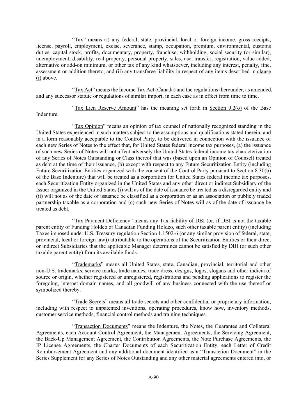 A-90 “Tax” means (i) any federal, state, provincial, local or foreign income, gross receipts, license, payroll, employment, excise, severance, stamp, occupation, premium, environmental, customs duties, capital stock, profits, documentary, property, franchise, withholding, social security (or similar), unemployment, disability, real property, personal property, sales, use, transfer, registration, value added, alternative or add-on minimum, or other tax of any kind whatsoever, including any interest, penalty, fine, assessment or addition thereto, and (ii) any transferee liability in respect of any items described in clause (i) above. “Tax Act” means the Income Tax Act (Canada) and the regulations thereunder, as amended, and any successor statute or regulations of similar import, in each case as in effect from time to time. “Tax Lien Reserve Amount” has the meaning set forth in Section 9.2(o) of the Base Indenture. “Tax Opinion” means an opinion of tax counsel of nationally recognized standing in the United States experienced in such matters subject to the assumptions and qualifications stated therein, and in a form reasonably acceptable to the Control Party, to be delivered in connection with the issuance of each new Series of Notes to the effect that, for United States federal income tax purposes, (a) the issuance of such new Series of Notes will not affect adversely the United States federal income tax characterization of any Series of Notes Outstanding or Class thereof that was (based upon an Opinion of Counsel) treated as debt at the time of their issuance, (b) except with respect to any Future Securitization Entity (including Future Securitization Entities organized with the consent of the Control Party pursuant to Section 8.30(b) of the Base Indenture) that will be treated as a corporation for United States federal income tax purposes, each Securitization Entity organized in the United States and any other direct or indirect Subsidiary of the Issuer organized in the United States (i) will as of the date of issuance be treated as a disregarded entity and (ii) will not as of the date of issuance be classified as a corporation or as an association or publicly traded partnership taxable as a corporation and (c) such new Series of Notes will as of the date of issuance be treated as debt. “Tax Payment Deficiency” means any Tax liability of DBI (or, if DBI is not the taxable parent entity of Funding Holdco or Canadian Funding Holdco, such other taxable parent entity) (including Taxes imposed under U.S. Treasury regulation Section 1.1502-6 (or any similar provision of federal, state, provincial, local or foreign law)) attributable to the operations of the Securitization Entities or their direct or indirect Subsidiaries that the applicable Manager determines cannot be satisfied by DBI (or such other taxable parent entity) from its available funds. “Trademarks” means all United States, state, Canadian, provincial, territorial and other non-U.S. trademarks, service marks, trade names, trade dress, designs, logos, slogans and other indicia of source or origin, whether registered or unregistered, registrations and pending applications to register the foregoing, internet domain names, and all goodwill of any business connected with the use thereof or symbolized thereby. “Trade Secrets” means all trade secrets and other confidential or proprietary information, including with respect to unpatented inventions, operating procedures, know how, inventory methods, customer service methods, financial control methods and training techniques. “Transaction Documents” means the Indenture, the Notes, the Guarantee and Collateral Agreements, each Account Control Agreement, the Management Agreements, the Servicing Agreement, the Back-Up Management Agreement, the Contribution Agreements, the Note Purchase Agreements, the IP License Agreements, the Charter Documents of each Securitization Entity, each Letter of Credit Reimbursement Agreement and any additional document identified as a “Transaction Document” in the Series Supplement for any Series of Notes Outstanding and any other material agreements entered into, or