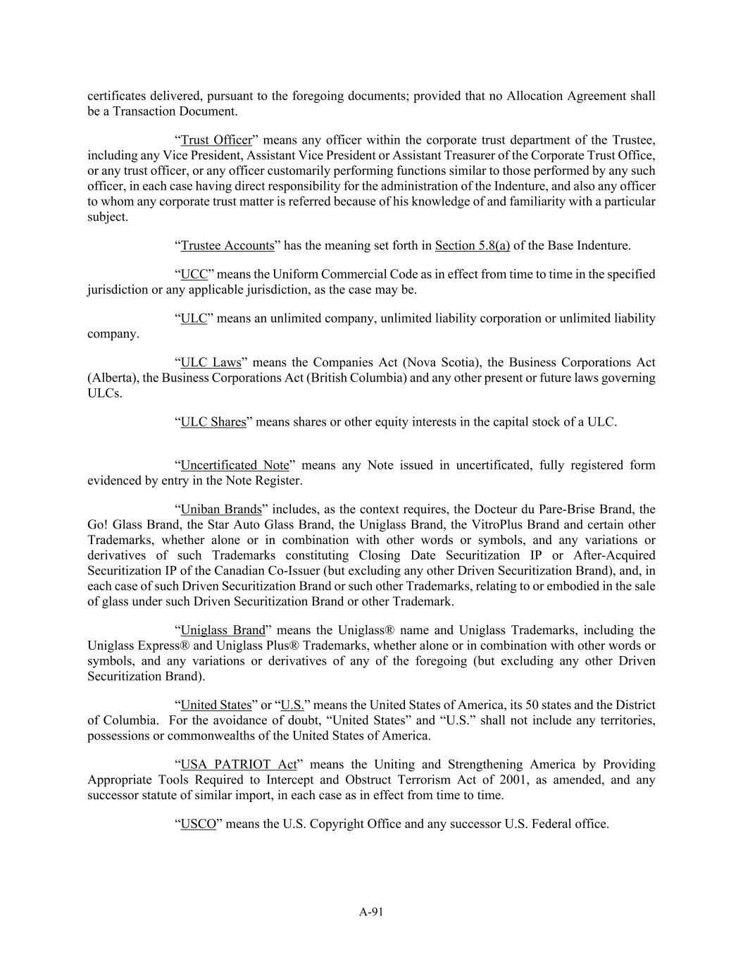 A-91 certificates delivered, pursuant to the foregoing documents; provided that no Allocation Agreement shall be a Transaction Document. “Trust Officer” means any officer within the corporate trust department of the Trustee, including any Vice President, Assistant Vice President or Assistant Treasurer of the Corporate Trust Office, or any trust officer, or any officer customarily performing functions similar to those performed by any such officer, in each case having direct responsibility for the administration of the Indenture, and also any officer to whom any corporate trust matter is referred because of his knowledge of and familiarity with a particular subject. “Trustee Accounts” has the meaning set forth in Section 5.8(a) of the Base Indenture. “UCC” means the Uniform Commercial Code as in effect from time to time in the specified jurisdiction or any applicable jurisdiction, as the case may be. “ULC” means an unlimited company, unlimited liability corporation or unlimited liability company. “ULC Laws” means the Companies Act (Nova Scotia), the Business Corporations Act (Alberta), the Business Corporations Act (British Columbia) and any other present or future laws governing ULCs. “ULC Shares” means shares or other equity interests in the capital stock of a ULC. “Uncertificated Note” means any Note issued in uncertificated, fully registered form evidenced by entry in the Note Register. “Uniban Brands” includes, as the context requires, the Docteur du Pare-Brise Brand, the Go! Glass Brand, the Star Auto Glass Brand, the Uniglass Brand, the VitroPlus Brand and certain other Trademarks, whether alone or in combination with other words or symbols, and any variations or derivatives of such Trademarks constituting Closing Date Securitization IP or After-Acquired Securitization IP of the Canadian Co-Issuer (but excluding any other Driven Securitization Brand), and, in each case of such Driven Securitization Brand or such other Trademarks, relating to or embodied in the sale of glass under such Driven Securitization Brand or other Trademark. “Uniglass Brand” means the Uniglass® name and Uniglass Trademarks, including the Uniglass Express® and Uniglass Plus® Trademarks, whether alone or in combination with other words or symbols, and any variations or derivatives of any of the foregoing (but excluding any other Driven Securitization Brand). “United States” or “U.S.” means the United States of America, its 50 states and the District of Columbia. For the avoidance of doubt, “United States” and “U.S.” shall not include any territories, possessions or commonwealths of the United States of America. “USA PATRIOT Act” means the Uniting and Strengthening America by Providing Appropriate Tools Required to Intercept and Obstruct Terrorism Act of 2001, as amended, and any successor statute of similar import, in each case as in effect from time to time. “USCO” means the U.S. Copyright Office and any successor U.S. Federal office.