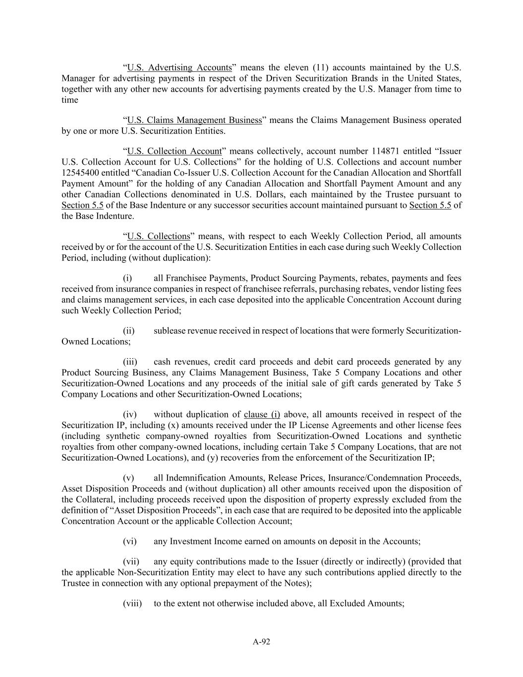 A-92 “U.S. Advertising Accounts” means the eleven (11) accounts maintained by the U.S. Manager for advertising payments in respect of the Driven Securitization Brands in the United States, together with any other new accounts for advertising payments created by the U.S. Manager from time to time “U.S. Claims Management Business” means the Claims Management Business operated by one or more U.S. Securitization Entities. “U.S. Collection Account” means collectively, account number 114871 entitled “Issuer U.S. Collection Account for U.S. Collections” for the holding of U.S. Collections and account number 12545400 entitled “Canadian Co-Issuer U.S. Collection Account for the Canadian Allocation and Shortfall Payment Amount” for the holding of any Canadian Allocation and Shortfall Payment Amount and any other Canadian Collections denominated in U.S. Dollars, each maintained by the Trustee pursuant to Section 5.5 of the Base Indenture or any successor securities account maintained pursuant to Section 5.5 of the Base Indenture. “U.S. Collections” means, with respect to each Weekly Collection Period, all amounts received by or for the account of the U.S. Securitization Entities in each case during such Weekly Collection Period, including (without duplication): (i) all Franchisee Payments, Product Sourcing Payments, rebates, payments and fees received from insurance companies in respect of franchisee referrals, purchasing rebates, vendor listing fees and claims management services, in each case deposited into the applicable Concentration Account during such Weekly Collection Period; (ii) sublease revenue received in respect of locations that were formerly Securitization- Owned Locations; (iii) cash revenues, credit card proceeds and debit card proceeds generated by any Product Sourcing Business, any Claims Management Business, Take 5 Company Locations and other Securitization-Owned Locations and any proceeds of the initial sale of gift cards generated by Take 5 Company Locations and other Securitization-Owned Locations; (iv) without duplication of clause (i) above, all amounts received in respect of the Securitization IP, including (x) amounts received under the IP License Agreements and other license fees (including synthetic company-owned royalties from Securitization-Owned Locations and synthetic royalties from other company-owned locations, including certain Take 5 Company Locations, that are not Securitization-Owned Locations), and (y) recoveries from the enforcement of the Securitization IP; (v) all Indemnification Amounts, Release Prices, Insurance/Condemnation Proceeds, Asset Disposition Proceeds and (without duplication) all other amounts received upon the disposition of the Collateral, including proceeds received upon the disposition of property expressly excluded from the definition of “Asset Disposition Proceeds”, in each case that are required to be deposited into the applicable Concentration Account or the applicable Collection Account; (vi) any Investment Income earned on amounts on deposit in the Accounts; (vii) any equity contributions made to the Issuer (directly or indirectly) (provided that the applicable Non-Securitization Entity may elect to have any such contributions applied directly to the Trustee in connection with any optional prepayment of the Notes); (viii) to the extent not otherwise included above, all Excluded Amounts;