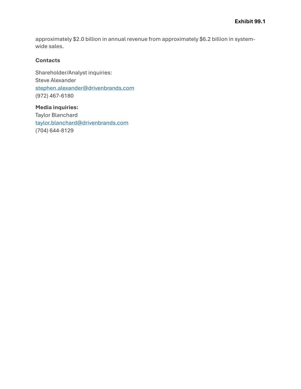 Driven Brands Closes $500 Million Securitization Issuance to Refinance Existing Debt CHARLOTTE, N.C., October 21, 2025 -- Driven Brands Holdings Inc. (“Driven Brands” or the “Company”) (NASDAQ: DRVN) announced today that it has closed an offering by certain of its subsidiaries for $500 million of Series 2025-1 Fixed Rate Senior Secured Notes, Class A- 2 (the “A-2 Notes”), maturing October 2055 and with an anticipated repayment date in October 2030. The proceeds from the issuance will be used in combination with funding from the Company’s revolving credit facility to refinance the Company’s Series 2019-1 and Series 2022-1 Class A-2 Fixed Rate Senior Secured Notes, to pay transaction-related fees and expenses and for general corporate purposes. This transaction was structured as a whole business securitization through Driven Brands Funding, LLC and Driven Brands Canada Funding Corporation and represents Driven Brands’ twelfth whole business securitization issuance. The A-2 Notes were priced at a coupon of 5.296% and have a five-year tenor through the anticipated repayment date. The A-2 Notes received ratings of BBB from Kroll Bond Rating Agency and BBB- from S&P Global Ratings, consistent with the Series 2024-1 Fixed Rate Senior Secured Notes, Class A-2, that closed in July 2024. The A-2 Notes are not registered under the Securities Act of 1933, as amended (the “Securities Act”) or any state securities laws, and may not be offered or sold in the United States absent registration or an applicable exemption from, or a transaction not subject to, the registration requirements of the Securities Act and applicable state securities laws. The A-2 Notes were offered only to qualified institutional buyers under Rule 144A and to persons outside the United States pursuant to Regulation S under the Securities Act. This press release is not an offer to sell, nor a solicitation of an offer to buy, any securities, nor shall there be any sale of these securities in any state or jurisdiction in which the offer, solicitation or sale would be unlawful prior to registration or qualification under the securities laws of such state or jurisdiction. About Driven Brands Driven Brands™, headquartered in Charlotte, NC, is the largest automotive services company in North America, providing a range of consumer and commercial automotive services, including paint, collision, glass, vehicle repair, oil change, maintenance and car wash. Driven Brands is the parent company of some of North America’s leading automotive service businesses including Take 5 Oil Change®, Meineke Car Care Centers®, Maaco®, 1-800-Radiator & A/C®, Auto Glass Now®, and CARSTAR®. Driven Brands has approximately 4,800 locations across the United States and 13 other countries, and services tens of millions of vehicles annually. Driven Brands’ network generates