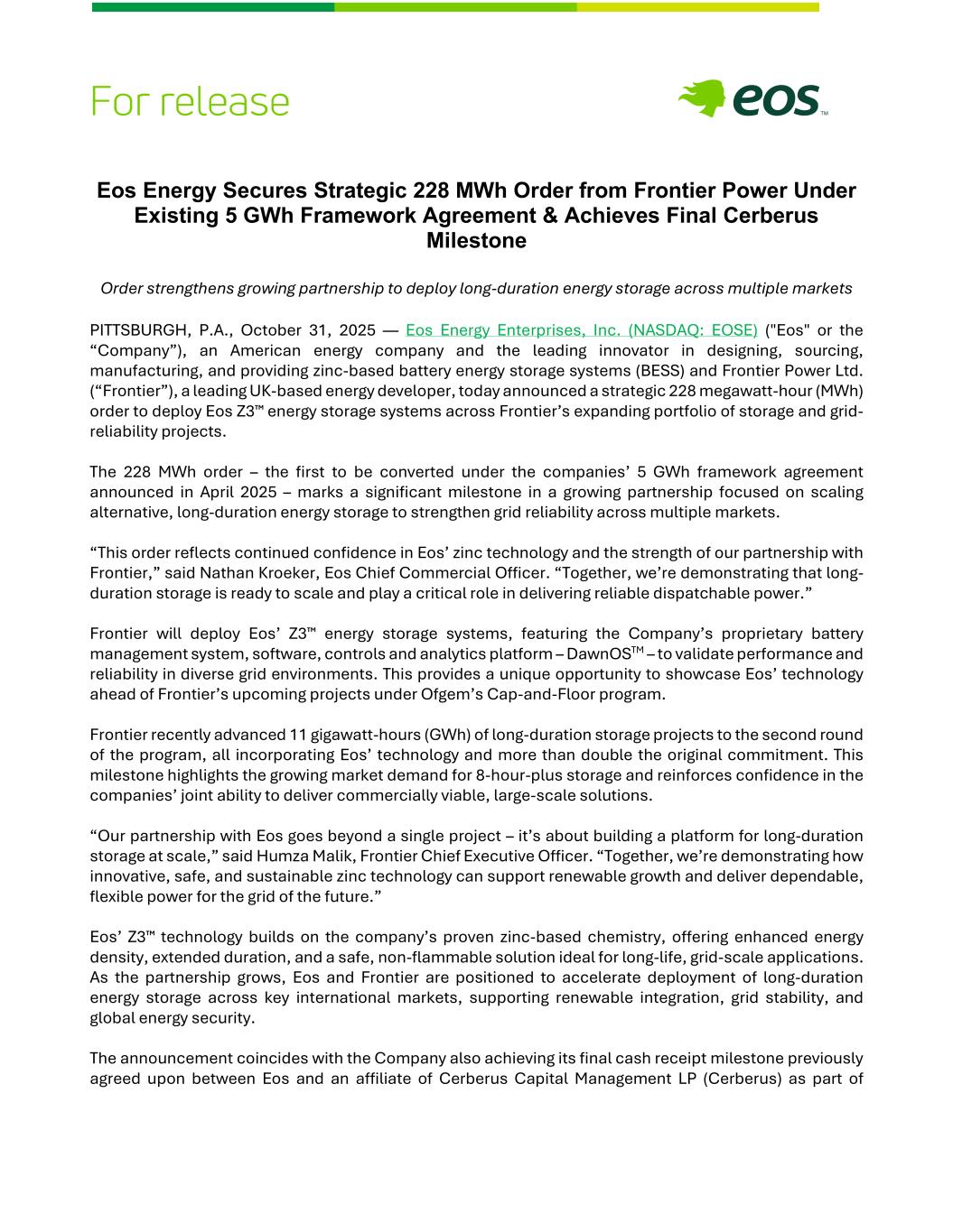 Eos Energy Secures Strategic 228 MWh Order from Frontier Power Under  Existing 5 GWh Framework Agreement & Achieves Final Cerberus  Milestone    Order strengthens growing partnership to deploy long-duration energy storage across multiple markets     PITTSBURGH, P.A., October 31, 2025 — Eos Energy Enterprises, Inc. (NASDAQ: EOSE) ("Eos" or the  “Company”), an American energy company and the leading innovator in designing, sourcing,  manufacturing, and providing zinc-based battery energy storage systems (BESS) and Frontier Power Ltd.  (“Frontier”), a leading UK-based energy developer, today announced a strategic 228 megawatt-hour (MWh)  order to deploy Eos Z3™ energy storage systems across Frontier’s expanding portfolio of storage and grid- reliability projects.     The 228 MWh order – the first to be converted under the companies’ 5 GWh framework agreement  announced in April 2025 – marks a significant milestone in a growing partnership focused on scaling  alternative, long-duration energy storage to strengthen grid reliability across multiple markets.     “This order reflects continued confidence in Eos’ zinc technology and the strength of our partnership with  Frontier,” said Nathan Kroeker, Eos Chief Commercial Officer. “Together, we’re demonstrating that long- duration storage is ready to scale and play a critical role in delivering reliable dispatchable power.”    Frontier will deploy Eos’ Z3™ energy storage systems, featuring the Company’s proprietary battery  management system, software, controls and analytics platform – DawnOSTM – to validate performance and  reliability in diverse grid environments. This provides a unique opportunity to showcase Eos’ technology  ahead of Frontier’s upcoming projects under Ofgem’s Cap-and-Floor program.     Frontier recently advanced 11 gigawatt-hours (GWh) of long-duration storage projects to the second round  of the program, all incorporating Eos’ technology and more than double the original commitment. This  milestone highlights the growing market demand for 8-hour-plus storage and reinforces confidence in the  companies’ joint ability to deliver commercially viable, large-scale solutions.    “Our partnership with Eos goes beyond a single project – it’s about building a platform for long-duration  storage at scale,” said Humza Malik, Frontier Chief Executive Officer. “Together, we’re demonstrating how  innovative, safe, and sustainable zinc technology can support renewable growth and deliver dependable,  flexible power for the grid of the future.”    Eos’ Z3™ technology builds on the company’s proven zinc-based chemistry, offering enhanced energy  density, extended duration, and a safe, non-flammable solution ideal for long-life, grid-scale applications.  As the partnership grows, Eos and Frontier are positioned to accelerate deployment of long-duration  energy storage across key international markets, supporting renewable integration, grid stability, and  global energy security.    The announcement coincides with the Company also achieving its final cash receipt milestone previously  agreed upon between Eos and an affiliate of Cerberus Capital Management LP (Cerberus) as part of