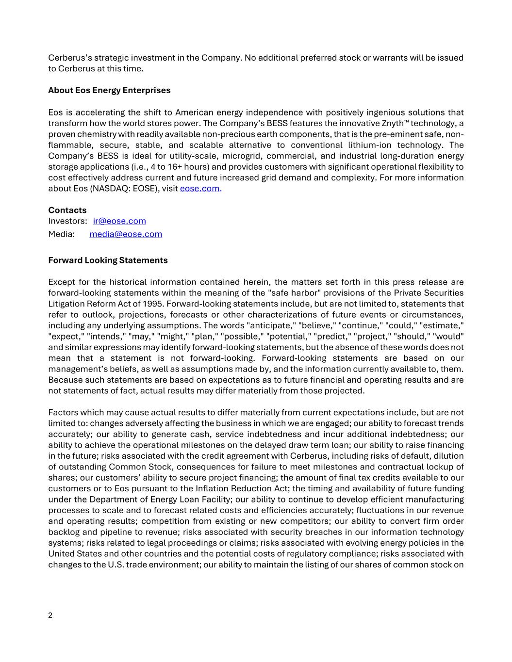 2  Cerberus’s strategic investment in the Company. No additional preferred stock or warrants will be issued  to Cerberus at this time.    About Eos Energy Enterprises    Eos is accelerating the shift to American energy independence with positively ingenious solutions that  transform how the world stores power. The Company’s BESS features the innovative Znyth™ technology, a  proven chemistry with readily available non-precious earth components, that is the pre-eminent safe, non- flammable, secure, stable, and scalable alternative to conventional lithium-ion technology. The  Company’s BESS is ideal for utility-scale, microgrid, commercial, and industrial long-duration energy  storage applications (i.e., 4 to 16+ hours) and provides customers with significant operational flexibility to  cost effectively address current and future increased grid demand and complexity. For more information  about Eos (NASDAQ: EOSE), visit eose.com.    Contacts   Investors:   ir@eose.com  Media:        media@eose.com    Forward Looking Statements    Except for the historical information contained herein, the matters set forth in this press release are  forward-looking statements within the meaning of the "safe harbor" provisions of the Private Securities  Litigation Reform Act of 1995. Forward-looking statements include, but are not limited to, statements that  refer to outlook, projections, forecasts or other characterizations of future events or circumstances,  including any underlying assumptions. The words "anticipate," "believe," "continue," "could," "estimate,"  "expect," "intends," "may," "might," "plan," "possible," "potential," "predict," "project," "should," "would"  and similar expressions may identify forward-looking statements, but the absence of these words does not  mean that a statement is not forward-looking. Forward-looking statements are based on our  management’s beliefs, as well as assumptions made by, and the information currently available to, them.  Because such statements are based on expectations as to future financial and operating results and are  not statements of fact, actual results may differ materially from those projected.     Factors which may cause actual results to differ materially from current expectations include, but are not  limited to: changes adversely affecting the business in which we are engaged; our ability to forecast trends  accurately; our ability to generate cash, service indebtedness and incur additional indebtedness; our  ability to achieve the operational milestones on the delayed draw term loan; our ability to raise financing  in the future; risks associated with the credit agreement with Cerberus, including risks of default, dilution  of outstanding Common Stock, consequences for failure to meet milestones and contractual lockup of  shares; our customers’ ability to secure project financing; the amount of final tax credits available to our  customers or to Eos pursuant to the Inflation Reduction Act; the timing and availability of future funding  under the Department of Energy Loan Facility; our ability to continue to develop efficient manufacturing  processes to scale and to forecast related costs and efficiencies accurately; fluctuations in our revenue  and operating results; competition from existing or new competitors; our ability to convert firm order  backlog and pipeline to revenue; risks associated with security breaches in our information technology  systems; risks related to legal proceedings or claims; risks associated with evolving energy policies in the  United States and other countries and the potential costs of regulatory compliance; risks associated with  changes to the U.S. trade environment; our ability to maintain the listing of our shares of common stock on