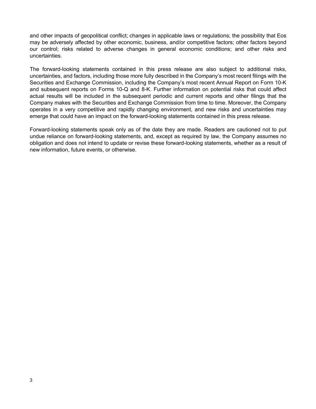 3 and other impacts of geopolitical conflict; changes in applicable laws or regulations; the possibility that Eos may be adversely affected by other economic, business, and/or competitive factors; other factors beyond our control; risks related to adverse changes in general economic conditions; and other risks and uncertainties. The forward-looking statements contained in this press release are also subject to additional risks, uncertainties, and factors, including those more fully described in the Company’s most recent filings with the Securities and Exchange Commission, including the Company’s most recent Annual Report on Form 10-K and subsequent reports on Forms 10-Q and 8-K. Further information on potential risks that could affect actual results will be included in the subsequent periodic and current reports and other filings that the Company makes with the Securities and Exchange Commission from time to time. Moreover, the Company operates in a very competitive and rapidly changing environment, and new risks and uncertainties may emerge that could have an impact on the forward-looking statements contained in this press release. Forward-looking statements speak only as of the date they are made. Readers are cautioned not to put undue reliance on forward-looking statements, and, except as required by law, the Company assumes no obligation and does not intend to update or revise these forward-looking statements, whether as a result of new information, future events, or otherwise.