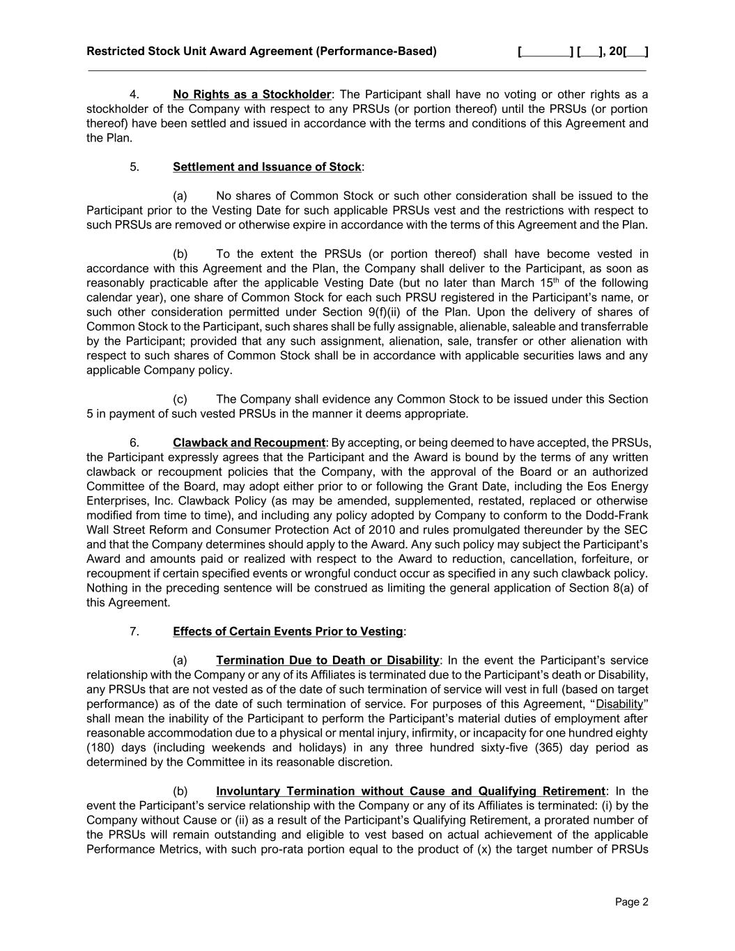 Restricted Stock Unit Award Agreement (Performance-Based) [________] [___], 20[___] _____________________________________________________________________________________________ Page 2 4. No Rights as a Stockholder: The Participant shall have no voting or other rights as a stockholder of the Company with respect to any PRSUs (or portion thereof) until the PRSUs (or portion thereof) have been settled and issued in accordance with the terms and conditions of this Agreement and the Plan. 5. Settlement and Issuance of Stock: (a) No shares of Common Stock or such other consideration shall be issued to the Participant prior to the Vesting Date for such applicable PRSUs vest and the restrictions with respect to such PRSUs are removed or otherwise expire in accordance with the terms of this Agreement and the Plan. (b) To the extent the PRSUs (or portion thereof) shall have become vested in accordance with this Agreement and the Plan, the Company shall deliver to the Participant, as soon as reasonably practicable after the applicable Vesting Date (but no later than March 15th of the following calendar year), one share of Common Stock for each such PRSU registered in the Participant’s name, or such other consideration permitted under Section 9(f)(ii) of the Plan. Upon the delivery of shares of Common Stock to the Participant, such shares shall be fully assignable, alienable, saleable and transferrable by the Participant; provided that any such assignment, alienation, sale, transfer or other alienation with respect to such shares of Common Stock shall be in accordance with applicable securities laws and any applicable Company policy. (c) The Company shall evidence any Common Stock to be issued under this Section 5 in payment of such vested PRSUs in the manner it deems appropriate. 6. Clawback and Recoupment: By accepting, or being deemed to have accepted, the PRSUs, the Participant expressly agrees that the Participant and the Award is bound by the terms of any written clawback or recoupment policies that the Company, with the approval of the Board or an authorized Committee of the Board, may adopt either prior to or following the Grant Date, including the Eos Energy Enterprises, Inc. Clawback Policy (as may be amended, supplemented, restated, replaced or otherwise modified from time to time), and including any policy adopted by Company to conform to the Dodd-Frank Wall Street Reform and Consumer Protection Act of 2010 and rules promulgated thereunder by the SEC and that the Company determines should apply to the Award. Any such policy may subject the Participant’s Award and amounts paid or realized with respect to the Award to reduction, cancellation, forfeiture, or recoupment if certain specified events or wrongful conduct occur as specified in any such clawback policy. Nothing in the preceding sentence will be construed as limiting the general application of Section 8(a) of this Agreement. 7. Effects of Certain Events Prior to Vesting: (a) Termination Due to Death or Disability: In the event the Participant’s service relationship with the Company or any of its Affiliates is terminated due to the Participant’s death or Disability, any PRSUs that are not vested as of the date of such termination of service will vest in full (based on target performance) as of the date of such termination of service. For purposes of this Agreement, “Disability” shall mean the inability of the Participant to perform the Participant’s material duties of employment after reasonable accommodation due to a physical or mental injury, infirmity, or incapacity for one hundred eighty (180) days (including weekends and holidays) in any three hundred sixty-five (365) day period as determined by the Committee in its reasonable discretion. (b) Involuntary Termination without Cause and Qualifying Retirement: In the event the Participant’s service relationship with the Company or any of its Affiliates is terminated: (i) by the Company without Cause or (ii) as a result of the Participant’s Qualifying Retirement, a prorated number of the PRSUs will remain outstanding and eligible to vest based on actual achievement of the applicable Performance Metrics, with such pro-rata portion equal to the product of (x) the target number of PRSUs