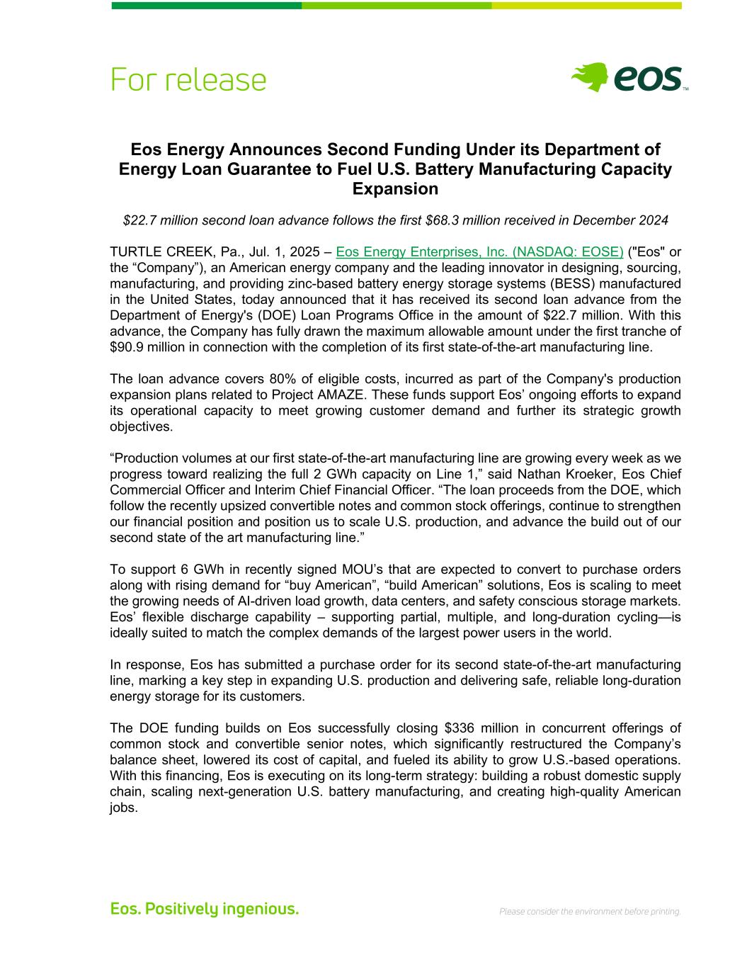 Eos Energy Announces Second Funding Under its Department of  Energy Loan Guarantee to Fuel U.S. Battery Manufacturing Capacity  Expansion    $22.7 million second loan advance follows the first $68.3 million received in December 2024    TURTLE CREEK, Pa., Jul. 1, 2025 – Eos Energy Enterprises, Inc. (NASDAQ: EOSE) ("Eos" or  the “Company”), an American energy company and the leading innovator in designing, sourcing,  manufacturing, and providing zinc-based battery energy storage systems (BESS) manufactured  in the United States, today announced that it has received its second loan advance from the  Department of Energy's (DOE) Loan Programs Office in the amount of $22.7 million. With this  advance, the Company has fully drawn the maximum allowable amount under the first tranche of  $90.9 million in connection with the completion of its first state-of-the-art manufacturing line.    The loan advance covers 80% of eligible costs, incurred as part of the Company's production  expansion plans related to Project AMAZE. These funds support Eos’ ongoing efforts to expand  its operational capacity to meet growing customer demand and further its strategic growth  objectives.    “Production volumes at our first state-of-the-art manufacturing line are growing every week as we  progress toward realizing the full 2 GWh capacity on Line 1,” said Nathan Kroeker, Eos Chief  Commercial Officer and Interim Chief Financial Officer. “The loan proceeds from the DOE, which  follow the recently upsized convertible notes and common stock offerings, continue to strengthen   our financial position and position us to scale U.S. production, and advance the build out of our  second state of the art manufacturing line.”    To support 6 GWh in recently signed MOU’s that are expected to convert to purchase orders  along with rising demand for “buy American”, “build American” solutions, Eos is scaling to meet  the growing needs of AI-driven load growth, data centers, and safety conscious storage markets.  Eos’ flexible discharge capability – supporting partial, multiple, and long-duration cycling—is  ideally suited to match the complex demands of the largest power users in the world.     In response, Eos has submitted a purchase order for its second state-of-the-art manufacturing  line, marking a key step in expanding U.S. production and delivering safe, reliable long-duration  energy storage for its customers.     The DOE funding builds on Eos successfully closing $336 million in concurrent offerings of  common stock and convertible senior notes, which significantly restructured the Company’s  balance sheet, lowered its cost of capital, and fueled its ability to grow U.S.-based operations.  With this financing, Eos is executing on its long-term strategy: building a robust domestic supply  chain, scaling next-generation U.S. battery manufacturing, and creating high-quality American  jobs.
