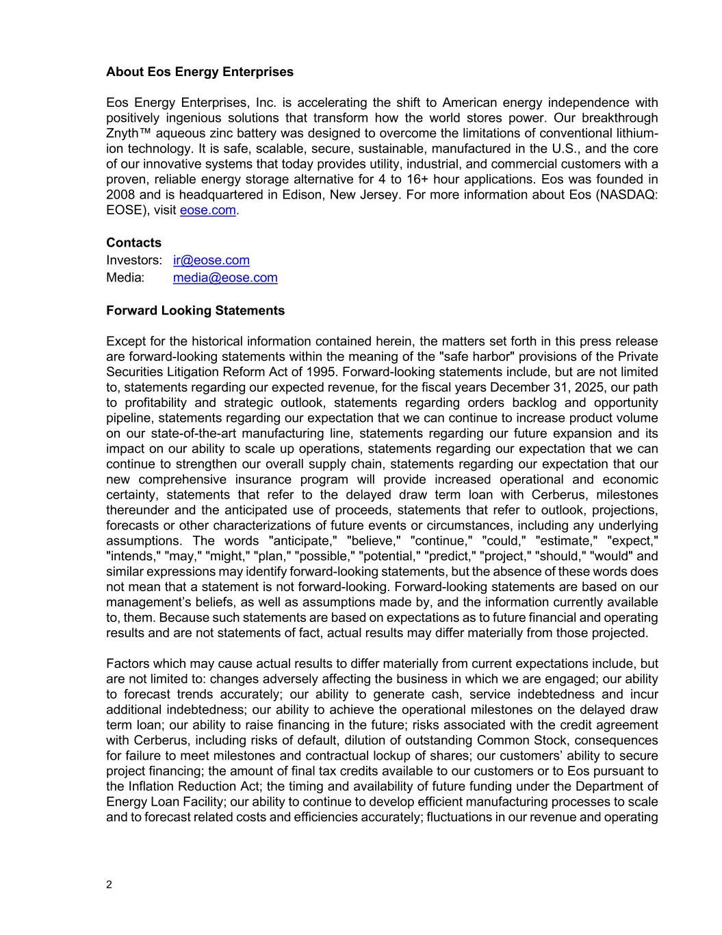 2  About Eos Energy Enterprises    Eos Energy Enterprises, Inc. is accelerating the shift to American energy independence with  positively ingenious solutions that transform how the world stores power. Our breakthrough  Znyth™ aqueous zinc battery was designed to overcome the limitations of conventional lithium- ion technology. It is safe, scalable, secure, sustainable, manufactured in the U.S., and the core  of our innovative systems that today provides utility, industrial, and commercial customers with a  proven, reliable energy storage alternative for 4 to 16+ hour applications. Eos was founded in  2008 and is headquartered in Edison, New Jersey. For more information about Eos (NASDAQ:  EOSE), visit eose.com.    Contacts   Investors:   ir@eose.com  Media:        media@eose.com     Forward Looking Statements    Except for the historical information contained herein, the matters set forth in this press release  are forward-looking statements within the meaning of the "safe harbor" provisions of the Private  Securities Litigation Reform Act of 1995. Forward-looking statements include, but are not limited  to, statements regarding our expected revenue, for the fiscal years December 31, 2025, our path  to profitability and strategic outlook, statements regarding orders backlog and opportunity  pipeline, statements regarding our expectation that we can continue to increase product volume  on our state-of-the-art manufacturing line, statements regarding our future expansion and its  impact on our ability to scale up operations, statements regarding our expectation that we can  continue to strengthen our overall supply chain, statements regarding our expectation that our  new comprehensive insurance program will provide increased operational and economic  certainty, statements that refer to the delayed draw term loan with Cerberus, milestones  thereunder and the anticipated use of proceeds, statements that refer to outlook, projections,  forecasts or other characterizations of future events or circumstances, including any underlying  assumptions. The words "anticipate," "believe," "continue," "could," "estimate," "expect,"  "intends," "may," "might," "plan," "possible," "potential," "predict," "project," "should," "would" and  similar expressions may identify forward-looking statements, but the absence of these words does  not mean that a statement is not forward-looking. Forward-looking statements are based on our  management’s beliefs, as well as assumptions made by, and the information currently available  to, them. Because such statements are based on expectations as to future financial and operating  results and are not statements of fact, actual results may differ materially from those projected.     Factors which may cause actual results to differ materially from current expectations include, but  are not limited to: changes adversely affecting the business in which we are engaged; our ability  to forecast trends accurately; our ability to generate cash, service indebtedness and incur  additional indebtedness; our ability to achieve the operational milestones on the delayed draw  term loan; our ability to raise financing in the future; risks associated with the credit agreement  with Cerberus, including risks of default, dilution of outstanding Common Stock, consequences  for failure to meet milestones and contractual lockup of shares; our customers’ ability to secure  project financing; the amount of final tax credits available to our customers or to Eos pursuant to  the Inflation Reduction Act; the timing and availability of future funding under the Department of  Energy Loan Facility; our ability to continue to develop efficient manufacturing processes to scale  and to forecast related costs and efficiencies accurately; fluctuations in our revenue and operating