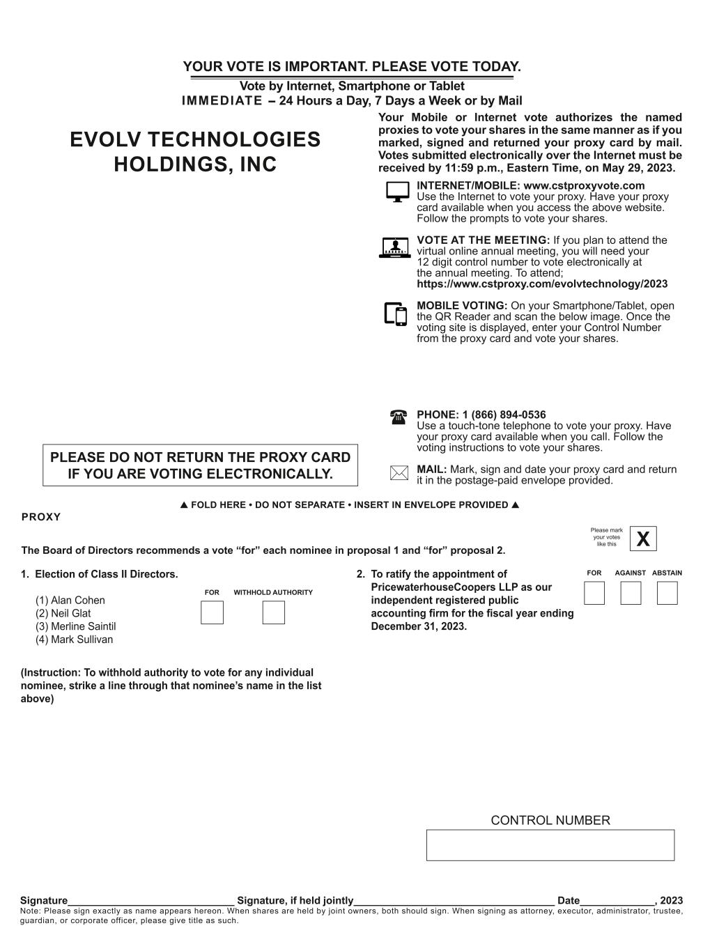 EVOLV TECHNOLOGIES HOLDINGS, INC FOLD HERE • DO NOT SEPARATE • INSERT IN ENVELOPE PROVIDED Signature_____________________________ Signature, if held jointly___________________________________ Date_____________, 2023 Note: Please sign exactly as name appears hereon. When shares are held by joint owners, both should sign. When signing as attorney, executor, administrator, trustee, guardian, or corporate officer, please give title as such. CONTROL NUMBER Please mark your votes like this X PROXY The Board of Directors recommends a vote “for” each nominee in proposal 1 and “for” proposal 2. FOR WITHHOLD AUTHORITY FOR AGAINST ABSTAIN YOUR VOTE IS IMPORTANT. PLEASE VOTE TODAY. IMMEDIATE - 24 Hours a Day, 7 Days a Week or by Mail Vote by Internet, Smartphone or Tablet Your Mobile or Internet vote authorizes the named proxies to vote your shares in the same manner as if you marked, signed and returned your proxy card by mail. Votes submitted electronically over the Internet must be received by 11:59 p.m., Eastern Time, on May 29, 2023. PLEASE DO NOT RETURN THE PROXY CARD IF YOU ARE VOTING ELECTRONICALLY. 1. Election of Class II Directors. (1) Alan Cohen (2) Neil Glat (3) Merline Saintil (4) Mark Sullivan 2. To ratify the appointment of PricewaterhouseCoopers LLP as our independent registered public accounting firm for the fiscal year ending December 31, 2023. (Instruction: To withhold authority to vote for any individual nominee, strike a line through that nominee’s name in the list above) INTERNET/MOBILE: www.cstproxyvote.com Use the Internet to vote your proxy. Have your proxy card available when you access the above website. Follow the prompts to vote your shares. VOTE AT THE MEETING: If you plan to attend the virtual online annual meeting, you will need your 12 digit control number to vote electronically at the annual meeting. To attend; https://www.cstproxy.com/evolvtechnology/2023 MOBILE VOTING: On your Smartphone/Tablet, open the QR Reader and scan the below image. Once the voting site is displayed, enter your Control Number from the proxy card and vote your shares. PHONE: 1 (866) 894-0536 Use a touch-tone telephone to vote your proxy. Have your proxy card available when you call. Follow the voting instructions to vote your shares. MAIL: Mark, sign and date your proxy card and return it in the postage-paid envelope provided.