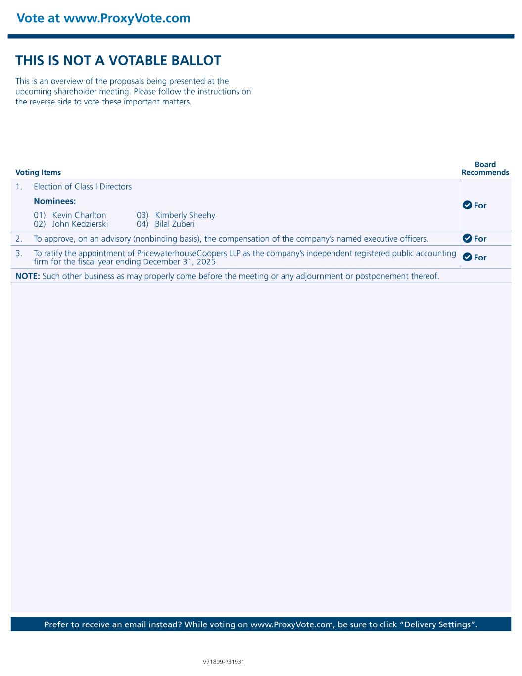 THIS IS NOT A VOTABLE BALLOT This is an overview of the proposals being presented at the upcoming shareholder meeting. Please follow the instructions on the reverse side to vote these important matters. Vote at www.ProxyVote.com Prefer to receive an email instead? While voting on www.ProxyVote.com, be sure to click “Delivery Settings”. Voting Items Board Recommends V71899-P31931 1. Election of Class I Directors For Nominees: 01) Kevin Charlton 02) John Kedzierski 03) Kimberly Sheehy 04) Bilal Zuberi 2. To approve, on an advisory (nonbinding basis), the compensation of the company’s named executive officers. For 3. To ratify the appointment of PricewaterhouseCoopers LLP as the company’s independent registered public accounting firm for the fiscal year ending December 31, 2025. For NOTE: Such other business as may properly come before the meeting or any adjournment or postponement thereof.