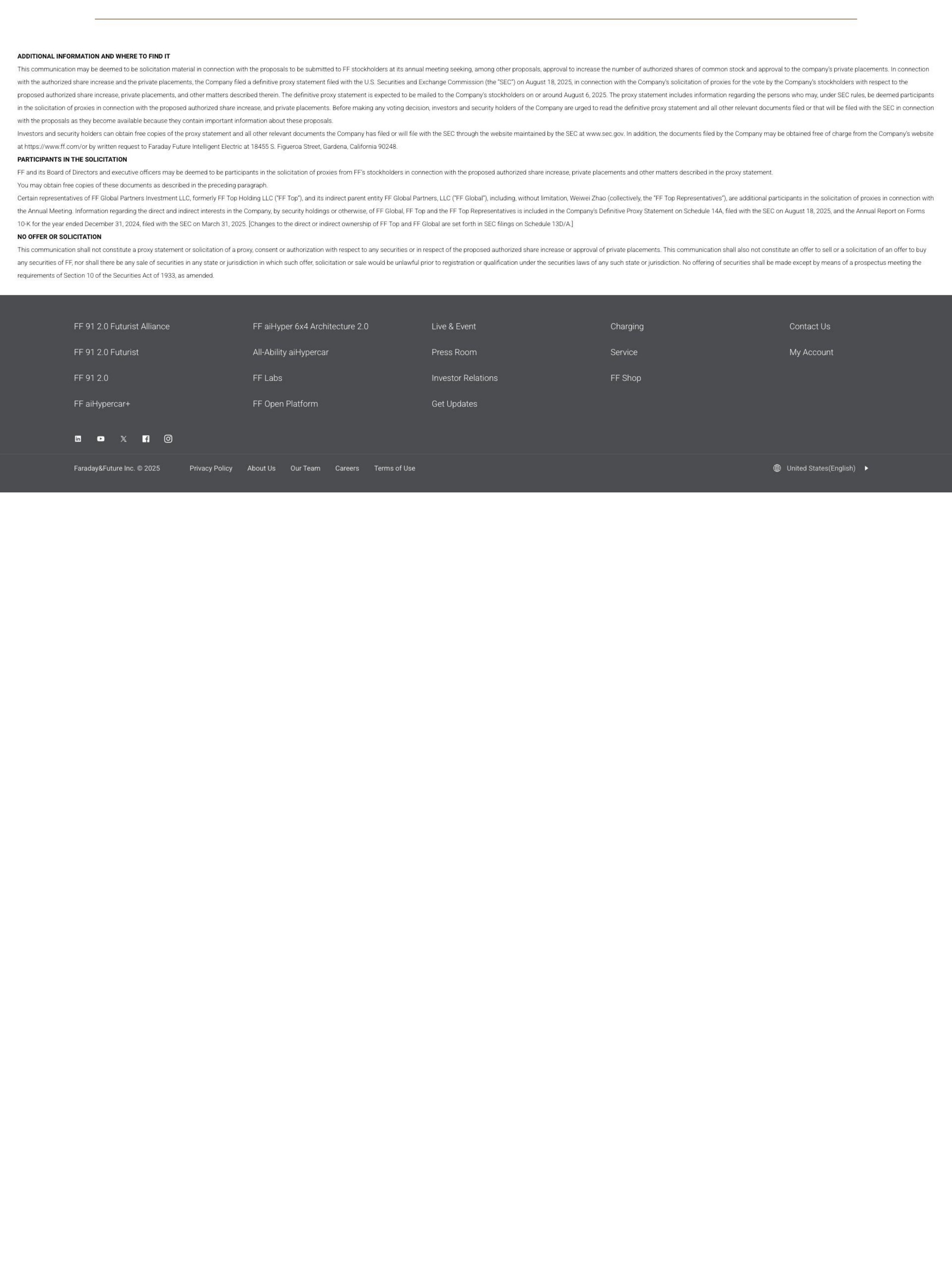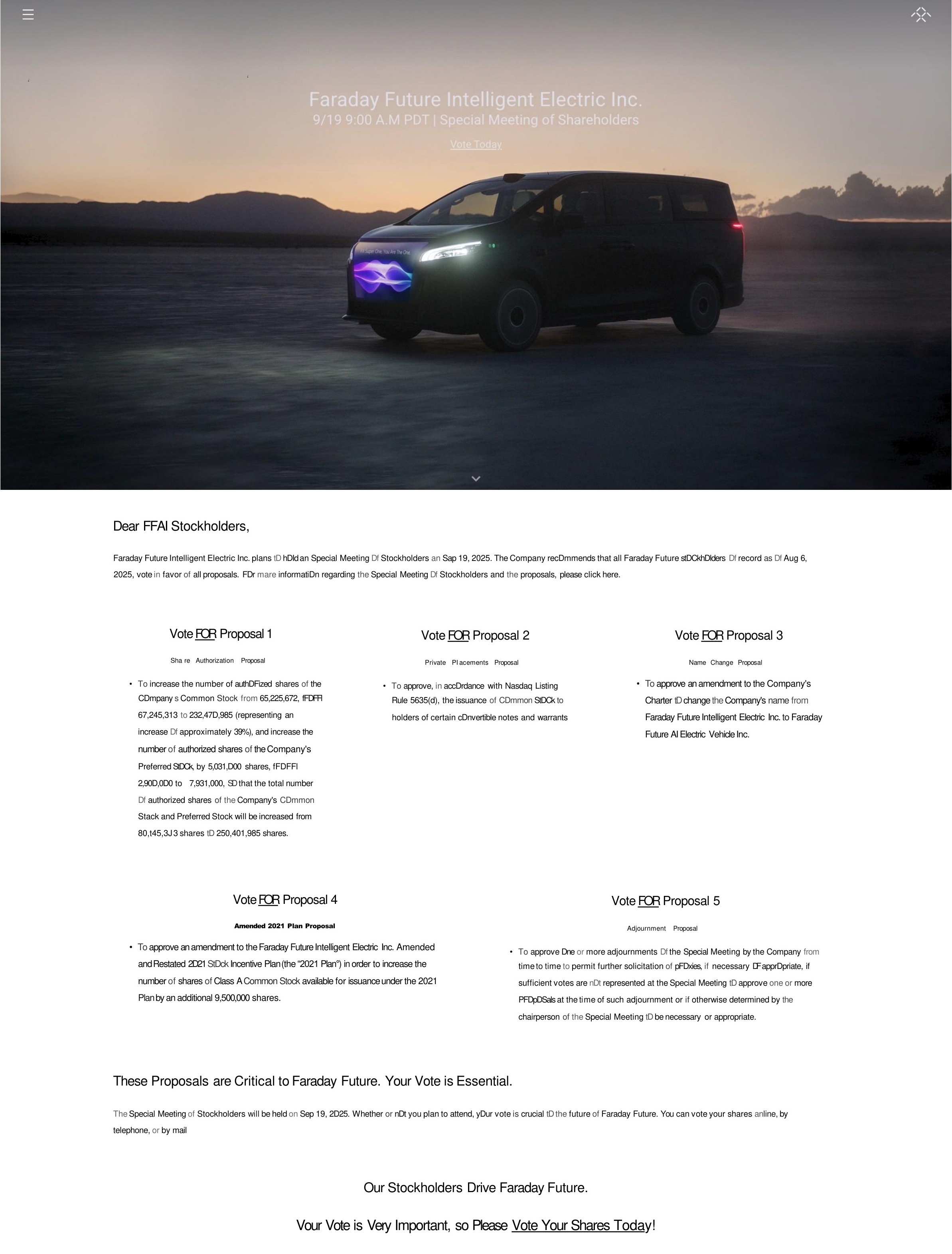 Dear FFAI Stockholders, Faraday Future Intelligent Electric Inc. plans tD hDId an Special Meeting Df Stockholders an Sap 19, 2025. The Company recDmmends that all Faraday Future stDCkhDlders Df record as Df Aug 6, 2025, vote in favor of all proposals. FDr mare informatiDn regarding the Special Meeting Df Stockholders and the proposals, please click here. Vote FOR Proposal 1 Sha re Authorization Proposal • To increase the number of authDFized shares of the CDmpany s Common Stock from 65,225,672, fFDFFl 67,245,313 to 232,47D,985 (representing an increase Df approximately 39%), and increase the number of authorized shares of the Company's Preferred StDCk, by 5,031,D00 shares, fFDFFl 2,90D,0D0 to 7,931,000, SD that the total number Df authorized shares of the Company's CDmmon Stack and Preferred Stock will be increased from 80,t45,3J 3 shares tD 250,401,985 shares. Vote FOR Proposal 4 Amended 2021 P lan Proposal Vote FOR Proposal 2 Private PI acements Proposal • To approve, in accDrdance with Nasdaq Listing Rule 5635(d), the issuance of CDmmon StDCk to holders of certain cDnvertible notes and warrants • To approve an amendment to the Faraday Future Intelligent Electric Inc. Amended and Restated 2D21 StDck Incentive Plan (the “2021 Plan ƒ ) in order to increase the number of shares of Class A Common Stock available for issuance under the 2021 Plan by an additional 9,500,000 shares. Vote FOR Proposal 3 Name Change Proposal • To approve an amendment to the Company's Charter tD change the Company's name from Faraday Future Intelligent Electric Inc. to Faraday Future AI Electric Vehicle Inc. Vote FOR Proposal 5 Adjournment Proposal • To approve Dne or more adjournments Df the Special Meeting by the Company from time to ti me to permit further solicitation of pFDxies, if necessary DF apprDpriate, if sufficient votes are nDt represented at the Special Meeting tD approve one or more PFDpDSals at the ti me of such adjournment or if otherwise determined by the chairperson of the Special Meeting tD be necessary or appropriate. These Proposals are Critical to Faraday Future. Your Vote is Essential. The Special Meeting of Stockholders will be held on Sep 19, 2D25. Whether or nDt you plan to attend, yDur vote is crucial tD the future of Faraday Future. You can vote your shares an line, by telephone, or by mail Our Stockholders Drive Faraday Future. Vour Vote is Very Important, so Please Vote Your Shares Toda y!