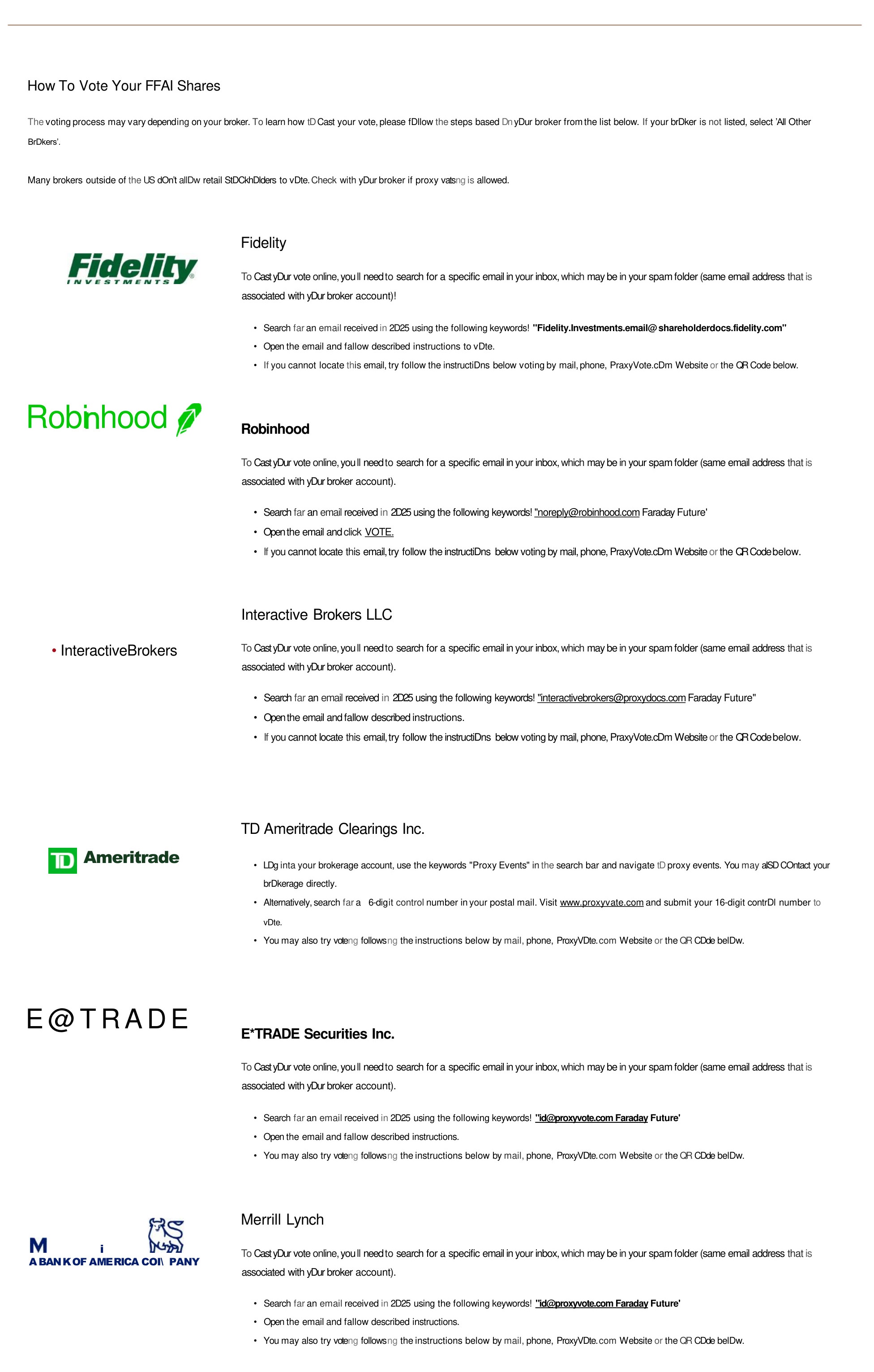 How To Vote Your FFAI Shares The voting process may vary depend ing on your broker. To learn how tD Cast your vote, please fDllow the steps based Dn yDur broker from the list below. If your brDker is not listed, select ’All Other BrDkers’. Many brokers outside of the US dOn’t allDw retail StDCkhDlders to vDte. Check with yDur broker if proxy vats ng is allowed. Robi hood • InteractiveBrokers Ameritrade E@TRADE i A BAN K OF A M E RICA COI \ PANY Fidelity To Cast yDur vote online, you II need to search for a specific email in your inbox, which may be in your spam folder (same email address that is associated with yDur broker account)! • Search far an email received in 2D25 using the following keywords! "Fidelity.Investments.email@ shareholderdocs.fidelity.com" • Open the email and fallow described instructions to vDte. • If you cannot locate th is email, try follow the i nstructiDns below voting by mail, phone, PraxyVote.cDm Website or the QR Code below. Robinhood To Cast yDur vote online, you II need to search for a specific email in your inbox, which may be in your spam folder (same email address that is associated with yDur broker account). • Search far an email received in 2D25 using the following keywords! "noreply@robinhood.com Faraday Future' • Open the email and click VOTE. • If you cannot locate this email, try follow the instructiDns below voting by mail, phone, PraxyVote.cDm Website or the QR Code below. Interactive Brokers LLC To Cast yDur vote online, you II need to search for a specific email in your inbox, which may be in your spam folder (same email address that is associated with yDur broker account). • Search far an email received in 2D25 using the following keywords! "interactivebrokers@proxydocs.com Faraday Future" • Open the email and fallow described instructions. • If you cannot locate this email, try follow the instructiDns below voting by mail, phone, PraxyVote.cDm Website or the QR Code below. TD Ameritrade Clearings Inc. • LDg inta your brokerage account, use the keywords "Proxy Events" in the search bar and navigate tD proxy events. You may aISD COntact your brDkerage directly. • Alternatively, search far a 6 - dig it control number in your postal mail. Visit www.proxyvate.com and submit your 16 - digit contrDl number to vDte. • You may also try vote ng follows ng the instructions below by mail, phone, ProxyVDte. com Website or the QR CDde belDw. E*TRADE Securities Inc. To Cast yDur vote online, you II need to search for a specific email in your inbox, which may be in your spam folder (same email address that is associated with yDur broker account). • Search far an email received in 2D25 using the following keywords! "id@proxyvote.com Faraday Future' • Open the email and fallow described instructions. • You may also try vote ng follows ng the instructions below by mail, phone, ProxyVDte. com Website or the QR CDde belDw. Merrill Lynch To Cast yDur vote online, you II need to search for a specific email in your inbox, which may be in your spam folder (same email address that is associated with yDur broker account). • Search far an email received in 2D25 using the following keywords! "id@proxyvote.com Faraday Future' • Open the email and fallow described instructions. • You may also try vote ng follows ng the instructions below by mail, phone, ProxyVDte. com Website or the QR CDde belDw.