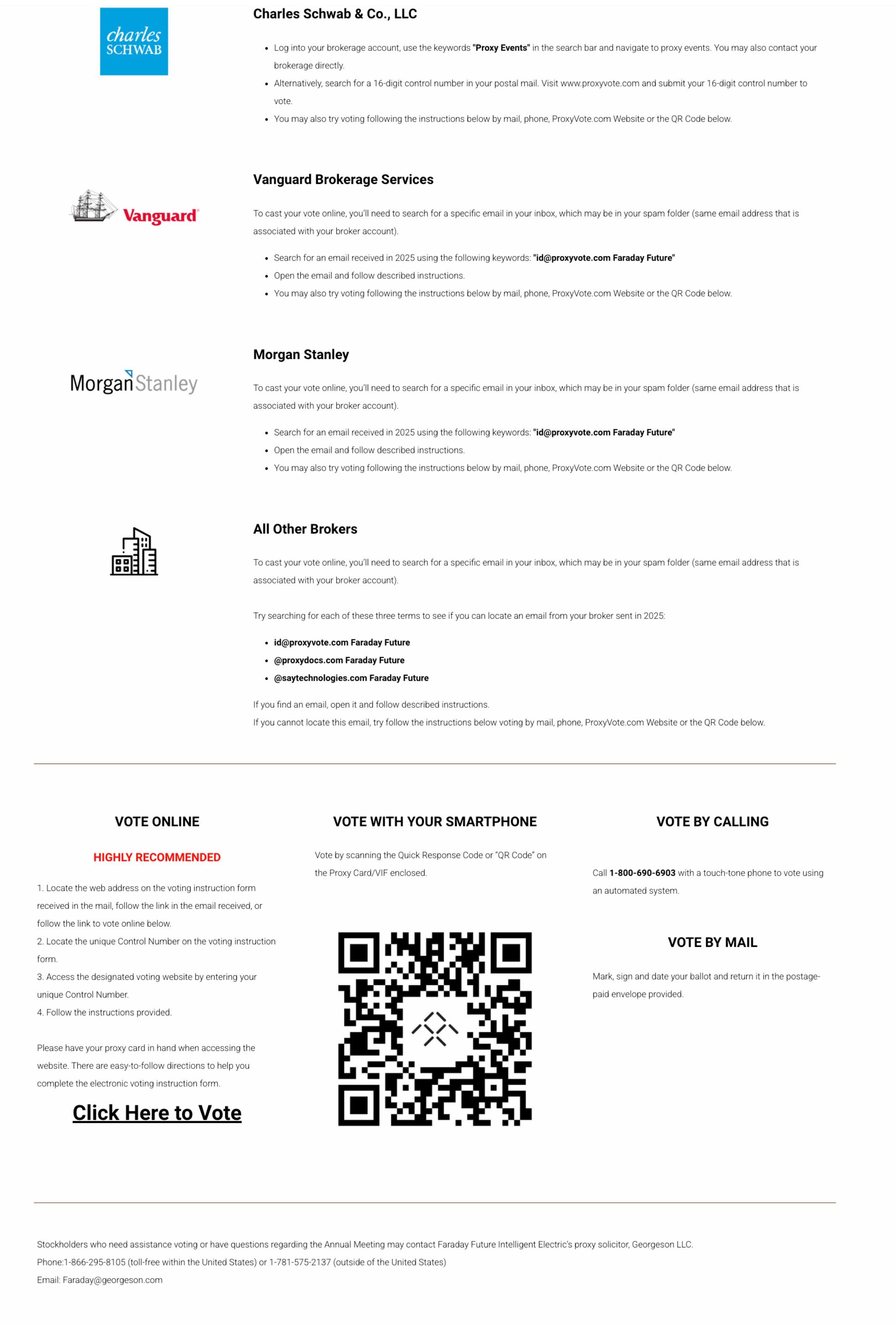 MorgagStanley VOTE ONLINE HIGHLY RECOMMEhIDED Charles Schwab & Co., LLC • LDg inta your brokerage account, use the keywords "Proxy Events" in the search bar and navigate tD proxy events. You may aISD COntact your brDkerage directly. • Alternatively, search far a 6 - dig it control number in your postal mail. Visit www.proxyvate.com and submit your 16 - digit contrDl number to vDte. • You may also try vote ng follows ng the instructions below by mail, phone, ProxyVDte. com Website or the QR CDde belDw. Vanguard Brokerage Services To Cast yDur vote online, you II need to search for a specific email in your inbox, which may be in your spam folder (same email address that is associated with yDur broker account). • Search far an email received in 2D25 using the following keywords! "id@proxyvote.com Faraday Future' • Open the email and fallow described instructions. • You may also try vote ng follows ng the instructions below by mail, phone, ProxyVDte. com Website or the QR CDde belDw. Morgan Stanley To Cast yDur vote online, you II need to search for a specific email in your inbox, which may be in your spam folder (same email address that is associated with yDur broker account). • Search far an email received in 2D25 using the following keywords! "id@proxyvote.com Faraday Future' • Open the email and fallow described instructions. • You may also try vote ng follows ng the instructions below by mail, phone, ProxyVDte. com Website or the QR CDde belDw. All Other Brokers To Cast yDur vote online, you II need to search for a specific email in your inbox, which may be in your spam folder (same email address that is associated with yDur broker account). Try searching for each of these three terms to see if yDu can lDcate an email from your broker sent i n 2025: • id@proxyvote.com Faraday Future • @proxydocs.com Faraday Future • @saytechnologies.com Faraday Future If you find an email, Dpen it and follow described instructions. If you cannot locate th is email, try follow the i nstructiDns below voting by mail, phone, PraxyVote.cDm Website or the QR Code below. Locate the web address Dn the voting instructiDn farm received in the mail, fDIIow the link in the email received, or follow the link to vote online below. 2 Locate the unique Control Number an the voting instruction form. 3 Access the designated voting website by entering your unique Control Number. 4. FDllow the instructions provided Please have yDur proxy ca Fd i n hand when accessing the website. There are easy - to - follDW directiDns tD help you complete the electronic voting instruction fDFFH Click Here to Vote VOTE WITH YOUR SMARTPHONE VDte by scanni ng the Quick Response Code or "g R CDde ƒ Dn the Proxy Card/VIF enclDsed. VOTE BY CALLING Call 1 - 8D0 - 690 - 690Z with a touch - tone phDne to vDte use ng an automated system. VOTE BY MAIL Mark, sign and date your ballot and return it in the pDstage - paid envelope provided Stockholders who need assistance voting DF have questions regarding the Annual Meeting may contact Faraday Future Intelligent Electric's proxy solicitor, Georgeson LLC. Phone:1 - 866 - 295 - 81 OF (toll - free within the United States) DF 1 - 781 - 575 - 2137 (outside of the United States) Email: Faraday@georgeson.cDFFi