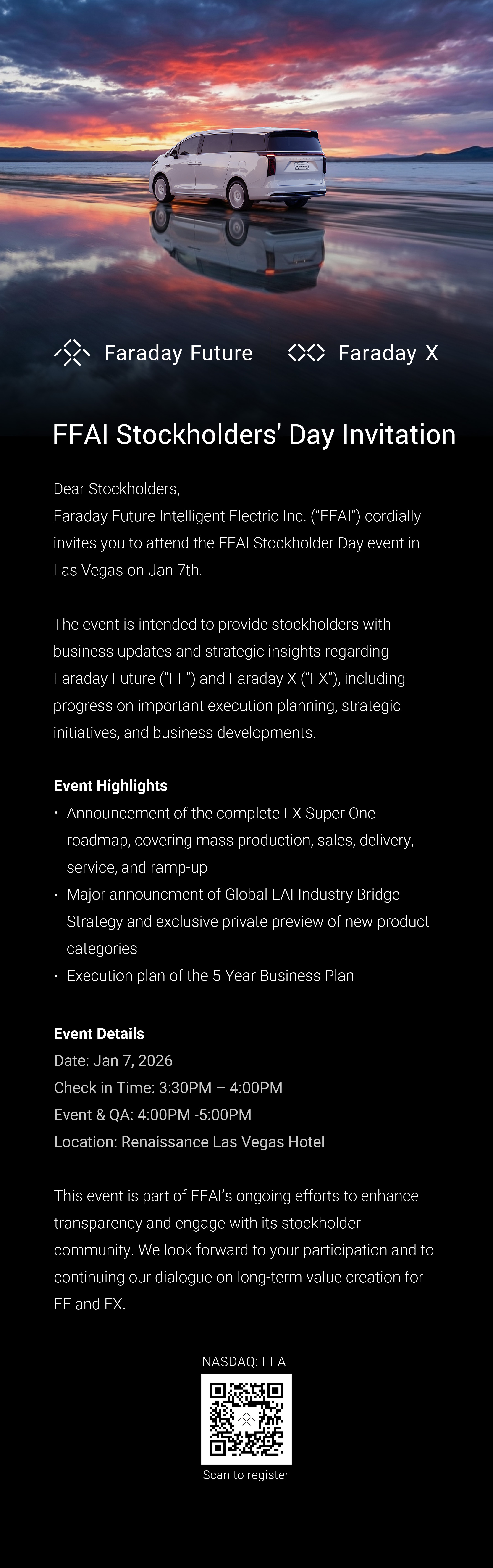 Los Angeles, CA (Dec. 29, 2025) – — Faraday Future Intelligent Electric Inc. (“Faraday Future,” “FF” or the “Company”) today announced that it plans to hold a Special Meeting of Stockholders (the “EGM”) on Feb 13, 2026, following key announcements planned for the January 7, 2026 Stockholders Day in Las Vegas, including FX Super One production and delivery, the upgraded Global Embodied AI (EAI) Industry Bridge Strategy, as well as a private event for the new EAI products.