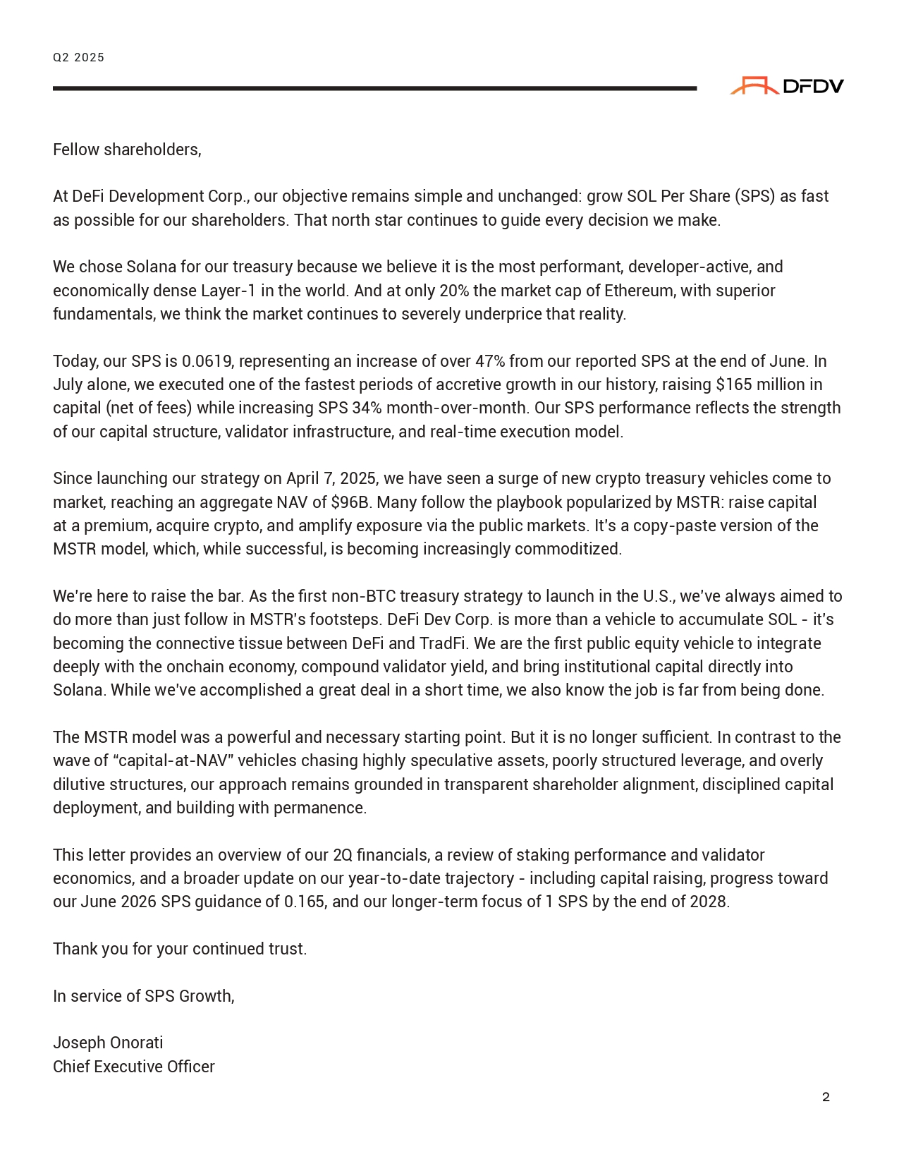 Fellow shareholders, At DeFi Development Corp., our objective remains simple and unchanged: grow SOL Per Share (SPS) as fast as possible for our shareholders. That north star continues to guide every decision we make. We chose Solana for our treasury because we believe it is the most performant, developer - active, and economically dense Layer - 1 in the world. And at only 20% the market cap of Ethereum, with superior fundamentals, we think the market continues to severely underprice that reality. Today, our SPS is 0.0619, representing an increase of over 47% from our reported SPS at the end of June. In July alone, we executed one of the fastest periods of accretive growth in our history, raising $165 million in capital (net of fees) while increasing SPS 34% month - over - month. Our SPS performance reflects the strength of our capital structure, validator infrastructure, and real - time execution model. Since launching our strategy on April 7, 2025, we have seen a surge of new crypto treasury vehicles come to market, reaching an aggregate NAV of $96B. Many follow the playbook popularized by MSTR: raise capital at a premium, acquire crypto, and amplify exposure via the public markets. It’s a copy - paste version of the MSTR model, which, while successful, is becoming increasingly commoditized. We’re here to raise the bar. As the first non - BTC treasury strategy to launch in the U.S., we’ve always aimed to do more than just follow in MSTR’s footsteps. DeFi Dev Corp. is more than a vehicle to accumulate SOL - it’s becoming the connective tissue between DeFi and TradFi. We are the first public equity vehicle to integrate deeply with the onchain economy, compound validator yield, and bring institutional capital directly into Solana. While we’ve accomplished a great deal in a short time, we also know the job is far from being done. The MSTR model was a powerful and necessary starting point. But it is no longer sufficient. In contrast to the wave of “capital - at - NAV” vehicles chasing highly speculative assets, poorly structured leverage, and overly dilutive structures, our approach remains grounded in transparent shareholder alignment, disciplined capital deployment, and building with permanence. This letter provides an overview of our 2Q financials, a review of staking performance and validator economics, and a broader update on our year - to - date trajectory - including capital raising, progress toward our June 2026 SPS guidance of 0.165, and our longer - term focus of 1 SPS by the end of 2028. Thank you for your continued trust. In service of SPS Growth, Joseph Onorati Chief Executive Officer Q2 2025 2