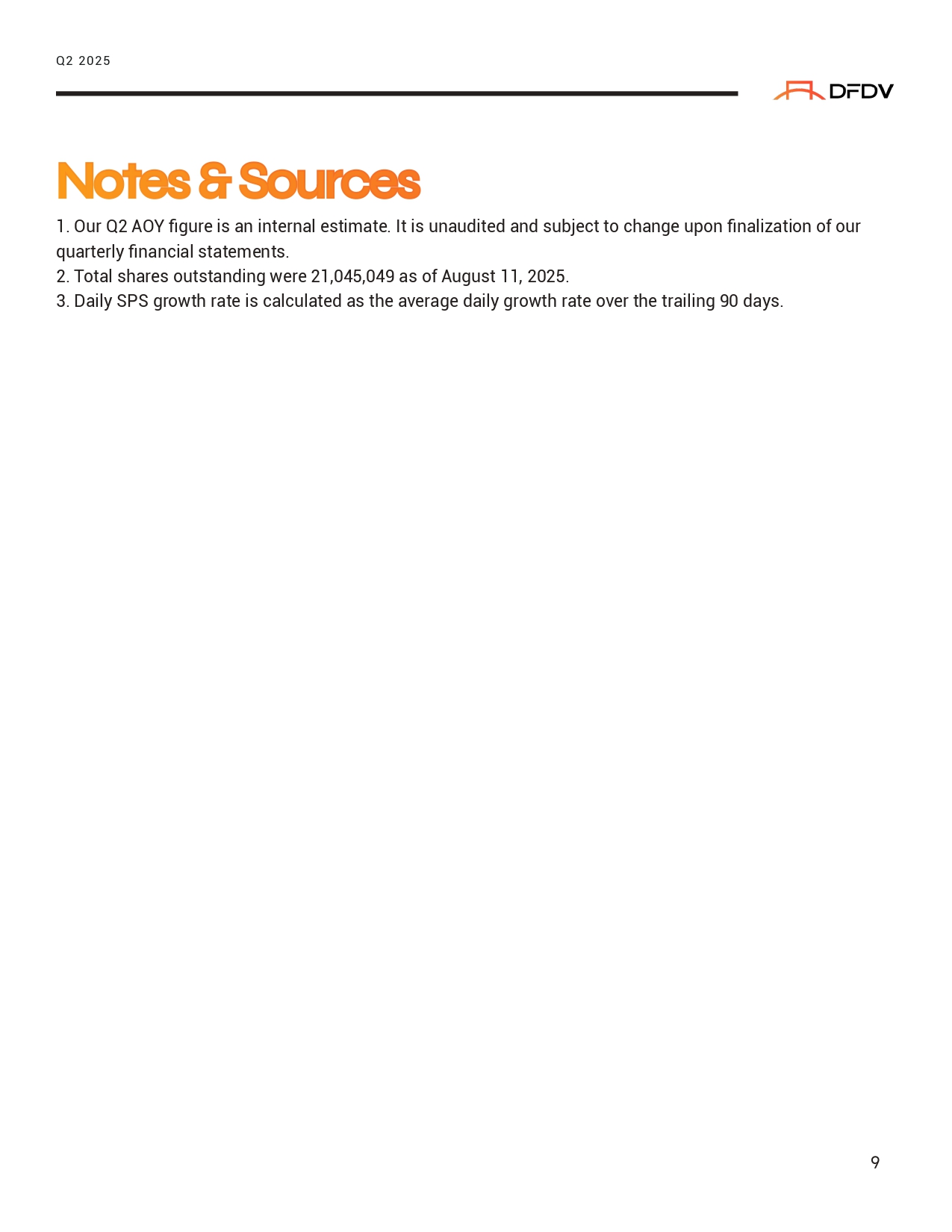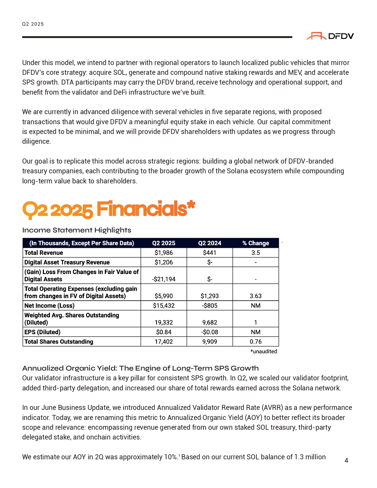 Under this model, we intend to partner with regional operators to launch localized public vehicles that mirror DFDV’s core strategy: acquire SOL, generate and compound native staking rewards and MEV, and accelerate SPS growth. DTA participants may carry the DFDV brand, receive technology and operational support, and benefit from the validator and DeFi infrastructure we’ve built. We are currently in advanced diligence with several vehicles in five separate regions, with proposed transactions that would give DFDV a meaningful equity stake in each vehicle. Our capital commitment is expected to be minimal, and we will provide DFDV shareholders with updates as we progress through diligence. Our goal is to replicate this model across strategic regions: building a global network of DFDV - branded treasury companies, each contributing to the broader growth of the Solana ecosystem while compounding long - term value back to shareholders. O2 2025 Fi ⭲ a ⭲ cials* I ⭲ come S ľ a ľ eme ⭲ ľ Hi σ» li σ»ľ s . 6 ⭲⭲ ualized Or σ a ⭲ ic Vield: A » e E ⭲σ i ⭲ e ot Lo ⭲σ - Aerm SPS “ row ľ» Our validator infrastructure is a key pillar for consistent SPS growth. In Q2, we scaled our validator footprint, added third - party delegation, and increased our share of total rewards earned across the Solana network. In our June Business Update, we introduced Annualized Validator Reward Rate (AVRR) as a new performance indicator. Today, we are renaming this metric to Annualized Organic Yield (AOY) to better reflect its broader scope and relevance: encompassing revenue generated from our own staked SOL treasury, third - party delegated stake, and onchain activities. Q2 2025 We estimate our AOY in 2Q was approximately 10%. ¹ Based on our current SOL balance of 1.3 million 4
