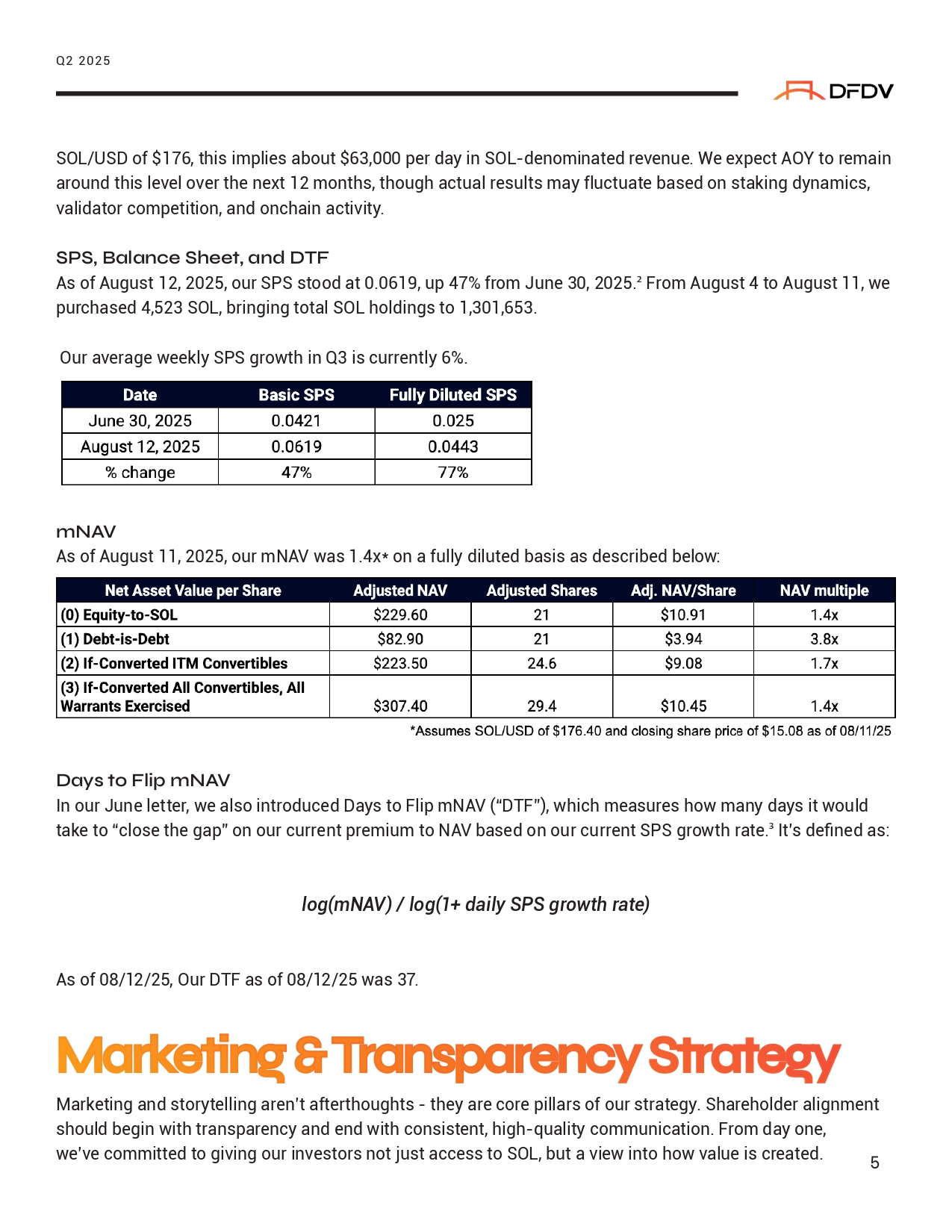 5 SOL/USD of $176, this implies about $63,000 per day in SOL - denominated revenue. We expect AOY to remain around this level over the next 12 months, though actual results may fluctuate based on staking dynamics, validator competition, and onchain activity. SPS, Bala ⭲ ce S » ee ľ , a ⭲ d DAF As of August 12, 2025, our SPS stood at 0.0619, up 47% from June 30, 2025. ² From August 4 to August 11, we purchased 4,523 SOL, bringing total SOL holdings to 1,301,653. Our average weekly SPS growth in Q3 is currently 6%. mN6V As of August 11, 2025, our mNAV was 1.4x* on a fully diluted basis as described below: Days ľ o Flip mN6V In our June letter, we also introduced Days to Flip mNAV (“DTF”), which measures how many days it would take to “close the gap” on our current premium to NAV based on our current SPS growth rate. ³ It’s defined as: log(mNAV) / log(1+ daily SPS growth rate) As of 08/12/25, Our DTF as of 08/12/25 was 37. Ma ǐ ke ľ i ⭲σ & A ǐ a ⭲ spa ǐ e ⭲ cQ S ľǐ a ľ e σ Q Marketing and storytelling aren’t afterthoughts - they are core pillars of our strategy. Shareholder alignment should begin with transparency and end with consistent, high - quality communication. From day one, we’ve committed to giving our investors not just access to SOL, but a view into how value is created. Q2 2025
