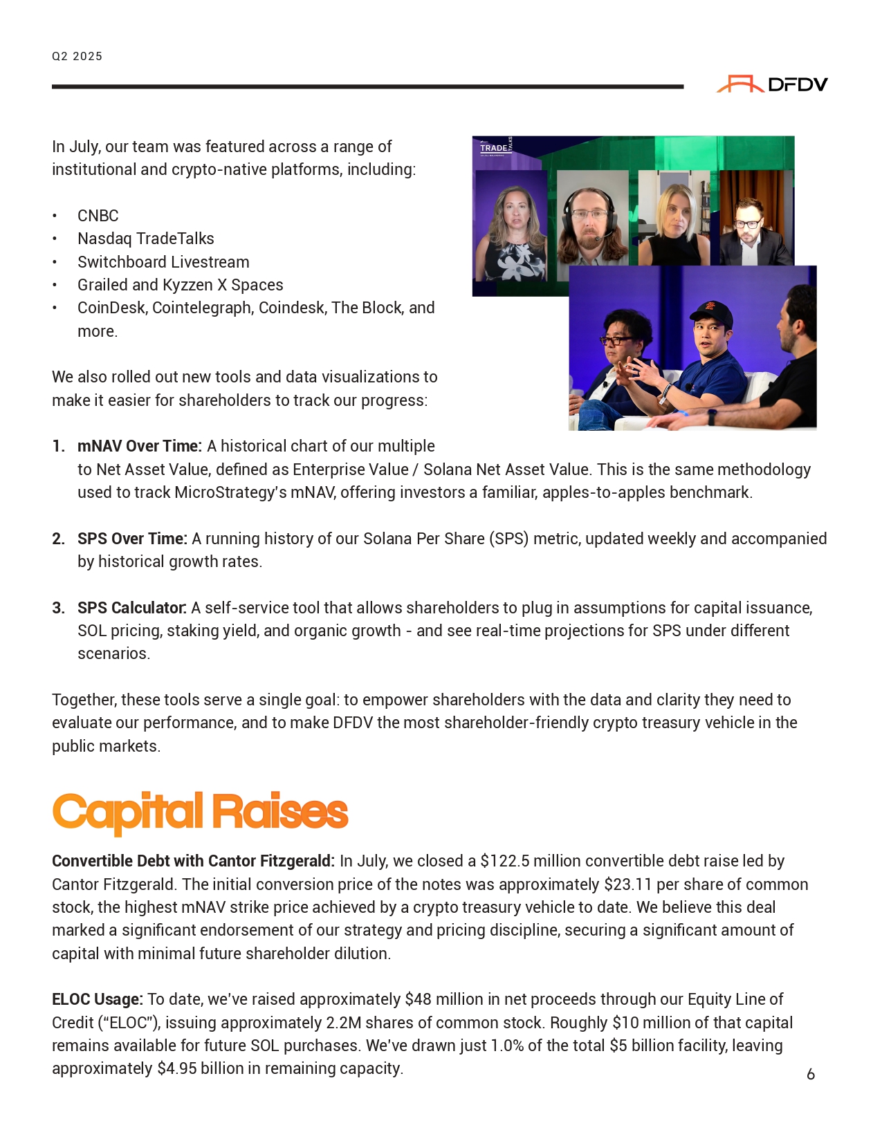 6 In July, our team was featured across a range of institutional and crypto - native platforms, including: • CNBC • Nasdaq TradeTalks • Switchboard Livestream • Grailed and Kyzzen X Spaces • CoinDesk, Cointelegraph, Coindesk, The Block, and more. We also rolled out new tools and data visualizations to make it easier for shareholders to track our progress: 1. mNAV Over Time: A historical chart of our multiple to Net Asset Value, defined as Enterprise Value / Solana Net Asset Value. This is the same methodology used to track MicroStrategy’s mNAV, offering investors a familiar, apples - to - apples benchmark. 2. SPS Over Time: A running history of our Solana Per Share (SPS) metric, updated weekly and accompanied by historical growth rates. 3. SPS Calculator: A self - service tool that allows shareholders to plug in assumptions for capital issuance, SOL pricing, staking yield, and organic growth - and see real - time projections for SPS under different scenarios. Together, these tools serve a single goal: to empower shareholders with the data and clarity they need to evaluate our performance, and to make DFDV the most shareholder - friendly crypto treasury vehicle in the public markets. Capi ľ al Raises Convertible Debt with Cantor Fitzgerald: In July, we closed a $122.5 million convertible debt raise led by Cantor Fitzgerald. The initial conversion price of the notes was approximately $23.11 per share of common stock, the highest mNAV strike price achieved by a crypto treasury vehicle to date. We believe this deal marked a significant endorsement of our strategy and pricing discipline, securing a significant amount of capital with minimal future shareholder dilution. ELOC Usage: To date, we’ve raised approximately $48 million in net proceeds through our Equity Line of Credit (“ELOC”), issuing approximately 2.2M shares of common stock. Roughly $10 million of that capital remains available for future SOL purchases. We’ve drawn just 1.0% of the total $5 billion facility, leaving approximately $4.95 billion in remaining capacity. Q2 2025