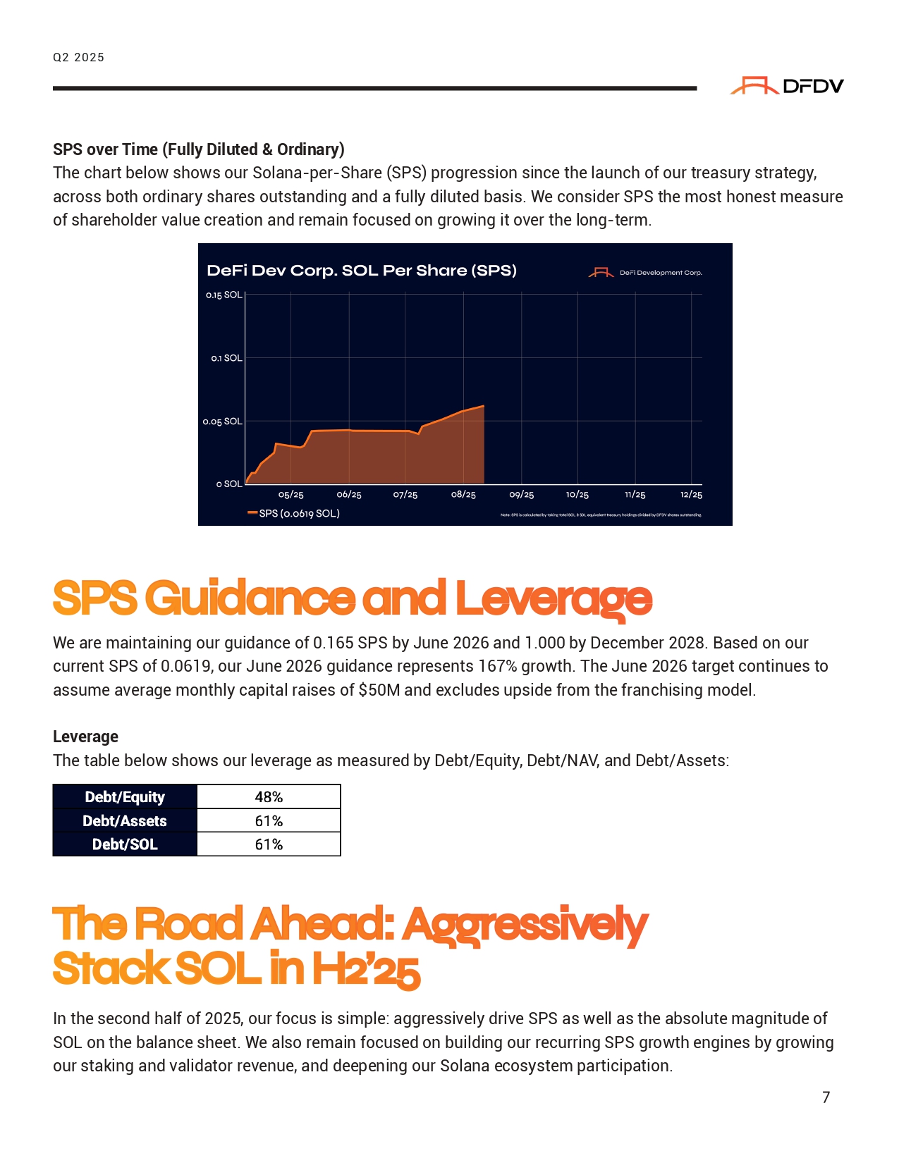 SPS over Time (Fully Diluted & Ordinary) The chart below shows our Solana - per - Share (SPS) progression since the launch of our treasury strategy, across both ordinary shares outstanding and a fully diluted basis. We consider SPS the most honest measure of shareholder value creation and remain focused on growing it over the long - term. SPS “ uida ⭲ ce a ⭲ d Leve ǐ a σ e We are maintaining our guidance of 0.165 SPS by June 2026 and 1.000 by December 2028. Based on our current SPS of 0.0619, our June 2026 guidance represents 167% growth. The June 2026 target continues to assume average monthly capital raises of $50M and excludes upside from the franchising model. Leverage The table below shows our leverage as measured by Debt/Equity, Debt/NAV, and Debt/Assets: Q2 2025 A » e Road A » ead: A σσǐ essivelQ S ľ ack SOL i ⭲ 2 ’ 2 5 In the second half of 2025, our focus is simple: aggressively drive SPS as well as the absolute magnitude of SOL on the balance sheet. We also remain focused on building our recurring SPS growth engines by growing our staking and validator revenue, and deepening our Solana ecosystem participation. 7