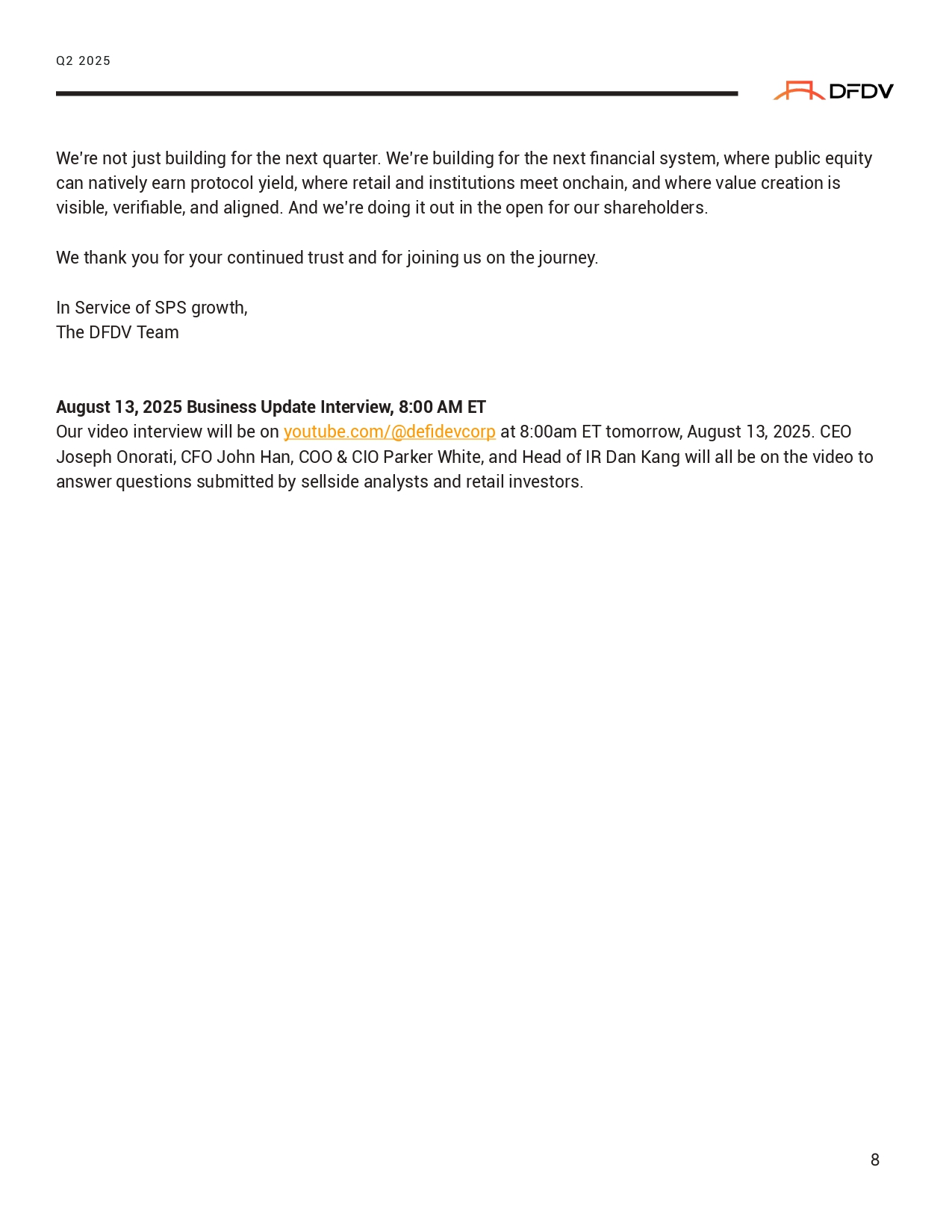 We’re not just building for the next quarter. We’re building for the next financial system, where public equity can natively earn protocol yield, where retail and institutions meet onchain, and where value creation is visible, verifiable, and aligned. And we’re doing it out in the open for our shareholders. We thank you for your continued trust and for joining us on the journey. In Service of SPS growth, The DFDV Team August 13, 2025 Business Update Interview, 8:00 AM ET Our video interview will be on youtube.com/@defidevcorp at 8:00am ET tomorrow, August 13, 2025. CEO Joseph Onorati, CFO John Han, COO & CIO Parker White, and Head of IR Dan Kang will all be on the video to answer questions submitted by sellside analysts and retail investors. Q2 2025 8