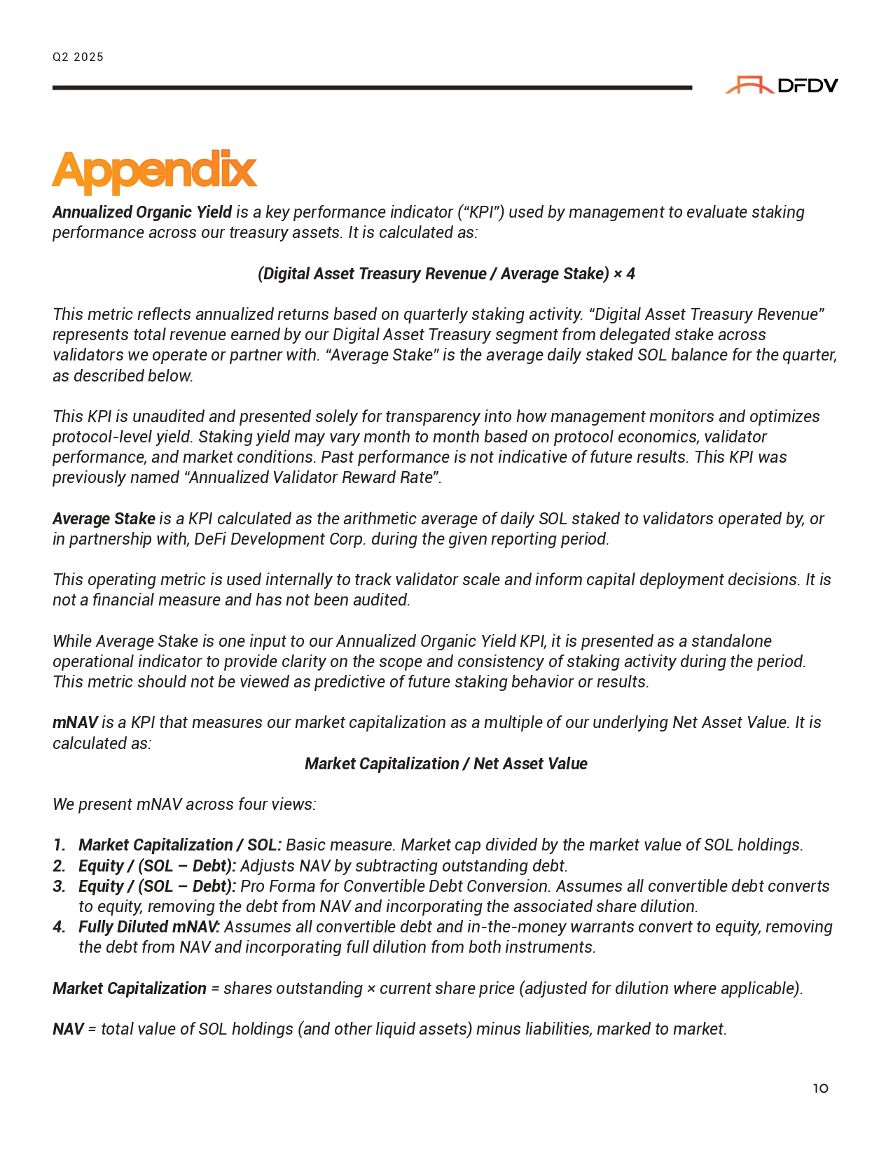 Appe ⭲ dix Annualized Organic Yield is a key performance indicator (“KPI”) used by management to evaluate staking performance across our treasury assets. It is calculated as: (Digital Asset Treasury Revenue / Average Stake) î 4 This metric reflects annualized returns based on quarterly staking activity. “Digital Asset Treasury Revenue” represents total revenue earned by our Digital Asset Treasury segment from delegated stake across validators we operate or partner with. “Average Stake” is the average daily staked SOL balance for the quarter, as described below. This KPI is unaudited and presented solely for transparency into how management monitors and optimizes protocol - level yield. Staking yield may vary month to month based on protocol economics, validator performance, and market conditions. Past performance is not indicative of future results. This KPI was previously named “Annualized Validator Reward Rate”. Average Stake is a KPI calculated as the arithmetic average of daily SOL staked to validators operated by, or in partnership with, DeFi Development Corp. during the given reporting period. This operating metric is used internally to track validator scale and inform capital deployment decisions. It is not a financial measure and has not been audited. While Average Stake is one input to our Annualized Organic Yield KPI, it is presented as a standalone operational indicator to provide clarity on the scope and consistency of staking activity during the period. This metric should not be viewed as predictive of future staking behavior or results. mNAV is a KPI that measures our market capitalization as a multiple of our underlying Net Asset Value. It is calculated as: Market Capitalization / Net Asset Value We present mNAV across four views: 1. Market Capitalization / SOL: Basic measure. Market cap divided by the market value of SOL holdings. 2. Equity / (SOL – Debt): Adjusts NAV by subtracting outstanding debt. 3. Equity / (SOL – Debt): Pro Forma for Convertible Debt Conversion. Assumes all convertible debt converts to equity, removing the debt from NAV and incorporating the associated share dilution. 4. Fully Diluted mNAV: Assumes all convertible debt and in - the - money warrants convert to equity, removing the debt from NAV and incorporating full dilution from both instruments. Market Capitalization = shares outstanding ƒ current share price (adjusted for dilution where applicable). NAV = total value of SOL holdings (and other liquid assets) minus liabilities, marked to market. Q2 2025 10