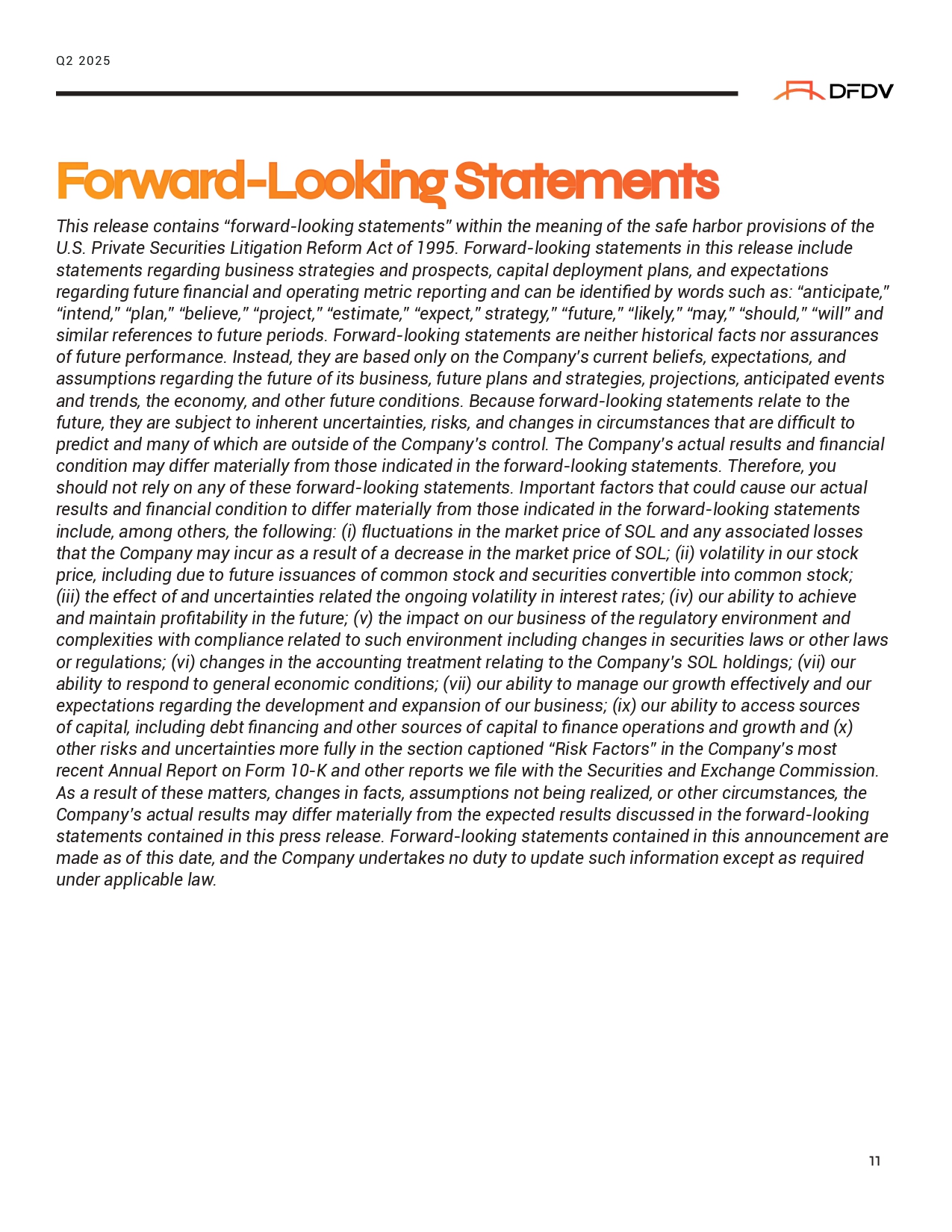 This release contains “forward - looking statements” within the meaning of the safe harbor provisions of the U.S. Private Securities Litigation Reform Act of 1995. Forward - looking statements in this release include statements regarding business strategies and prospects, capital deployment plans, and expectations regarding future financial and operating metric reporting and can be identified by words such as: “anticipate,” “intend,” “plan,” “believe,” “project,” “estimate,” “expect,” strategy,” “future,” “likely,” “may,” “should,” “will” and similar references to future periods. Forward - looking statements are neither historical facts nor assurances of future performance. Instead, they are based only on the Company’s current beliefs, expectations, and assumptions regarding the future of its business, future plans and strategies, projections, anticipated events and trends, the economy, and other future conditions. Because forward - looking statements relate to the future, they are subject to inherent uncertainties, risks, and changes in circumstances that are difficult to predict and many of which are outside of the Company’s control. The Company’s actual results and financial condition may differ materially from those indicated in the forward - looking statements. Therefore, you should not rely on any of these forward - looking statements. Important factors that could cause our actual results and financial condition to differ materially from those indicated in the forward - looking statements include, among others, the following: (i) fluctuations in the market price of SOL and any associated losses that the Company may incur as a result of a decrease in the market price of SOL; (ii) volatility in our stock price, including due to future issuances of common stock and securities convertible into common stock; (iii) the effect of and uncertainties related the ongoing volatility in interest rates; (iv) our ability to achieve and maintain profitability in the future; (v) the impact on our business of the regulatory environment and complexities with compliance related to such environment including changes in securities laws or other laws or regulations; (vi) changes in the accounting treatment relating to the Company’s SOL holdings; (vii) our ability to respond to general economic conditions; (vii) our ability to manage our growth effectively and our expectations regarding the development and expansion of our business; (ix) our ability to access sources of capital, including debt financing and other sources of capital to finance operations and growth and (x) other risks and uncertainties more fully in the section captioned “Risk Factors” in the Company’s most recent Annual Report on Form 10 - K and other reports we file with the Securities and Exchange Commission. As a result of these matters, changes in facts, assumptions not being realized, or other circumstances, the Company’s actual results may differ materially from the expected results discussed in the forward - looking statements contained in this press release. Forward - looking statements contained in this announcement are made as of this date, and the Company undertakes no duty to update such information except as required under applicable law. Fo ǐ wa ǐ d - Looki ⭲σ S ľ a ľ eme ⭲ ľ s Q2 2025 11