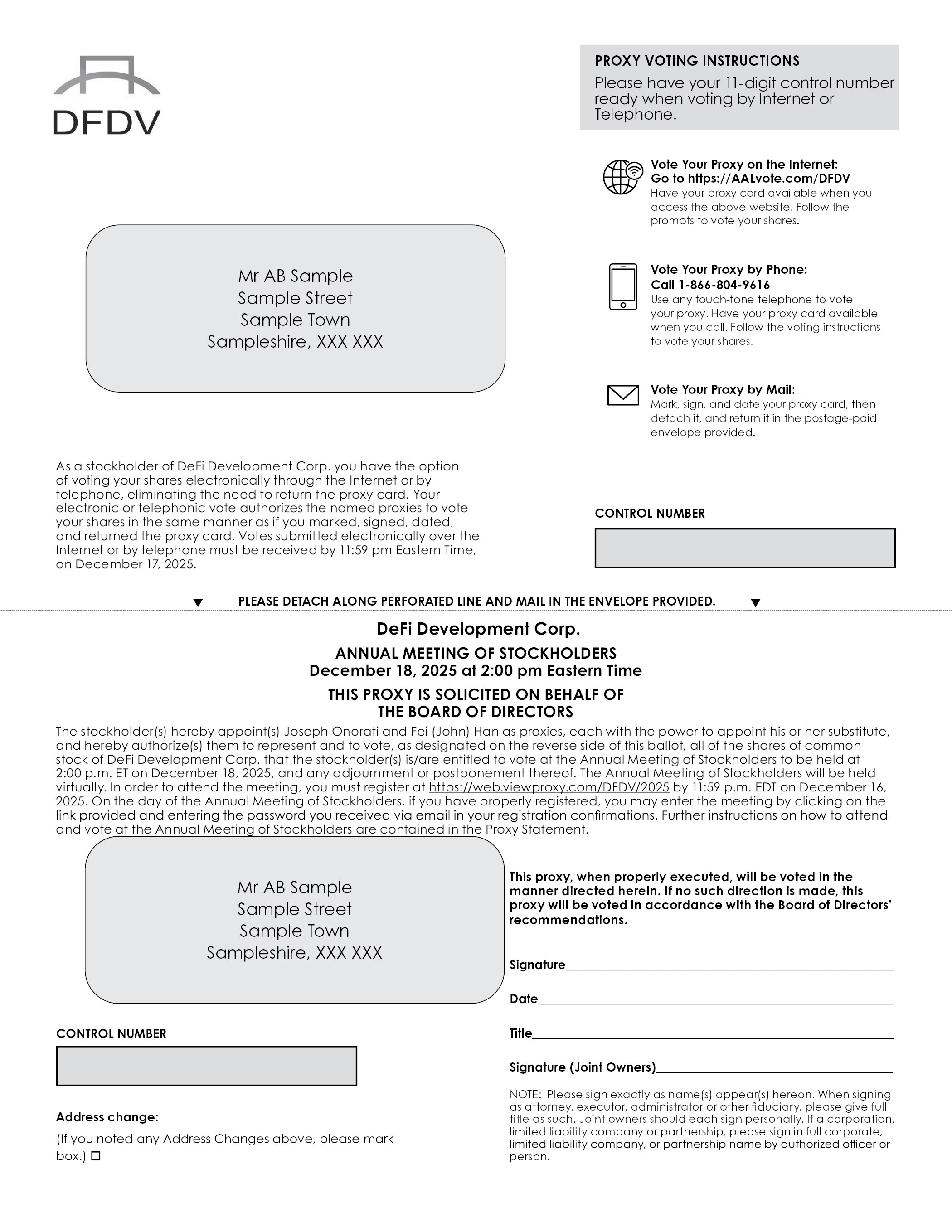 PROXY VOTING INSTRUCTIONS Please have your 11-digit control number ready when voting by Internet or Telephone. Vote Your Proxy on the Internet: Go to https://AALvote.com/DFDV Have your proxy card available when you access the above website. Follow the prompts to vote your shares. Vote Your Proxy by Phone: Call 1-866-804-9616 Use any touch-tone telephone to vote your proxy. Have your proxy card available when you call. Follow the voting instructions to vote your shares. Vote Your Proxy by Mail: Mark, sign, and date your proxy card, then detach it, and return it in the postage-paid envelope provided. As a stockholder of DeFi Development Corp. you have the option of voting your shares electronically through the Internet or by telephone, eliminating the need to return the proxy card. Your electronic or telephonic vote authorizes the named proxies to vote your shares in the same manner as if you marked, signed, dated, and returned the proxy card. Votes submitted electronically over the Internet or by telephone must be received by 11:59 pm Eastern Time, on December 17, 2025. CONTROL NUMBER As a stockholder of DeFi Development Corp. you have the option of voting your shares electronically through the Internet or by telephone, eliminating the need to return the proxy card. Your electronic or telephonic vote authorizes the named proxies to vote your shares in the same manner as if you marked, signed, dated, and returned the proxy card. Votes submitted electronically over the Internet or by telephone must be received by 11:59 pm Eastern Time, on December 17, 2025. PLEASE DETACH ALONG PERFORATED LINE AND MAIL IN THE ENVELOPE PROVIDED. DeFi Development Corp. ANNUAL MEETING OF STOCKHOLDERS December 18, 2025 at 2:00 pm Eastern Time THIS PROXY IS SOLICITED ON BEHALF OF THE BOARD OF DIRECTORS The stockholder(s) hereby appoint(s) Joseph Onorati and Fei (John) Han as proxies, each with the power to appoint his or her substitute, and hereby authorize(s) them to represent and to vote, as designated on the reverse side of this ballot, all of the shares of common stock of DeFi Development Corp. that the stockholder(s) is/are entitled to vote at the Annual Meeting of Stockholders to be held at 2:00 p.m. ET on December 18, 2025, and any adjournment or postponement thereof. The Annual Meeting of Stockholders will be held virtually. In order to attend the meeting, you must register at https://web.viewproxy.com/DFDV/2025 by 11:59 p.m. EDT on December 16, 2025. On the day of the Annual Meeting of Stockholders, if you have properly registered, you may enter the meeting by clicking on the link provided and entering the password you received via email in your registration confirmations. Further instructions on how to attend and vote at the Annual Meeting of Stockholders are contained in the Proxy Statement. This proxy, when properly executed, will be voted in the manner directed herein. If no such direction is made, this proxy will be voted in accordance with the Board of Directors’ recommendations. Mr AB Sample Sample Street Sample Town Sampleshire, XXX XXX Signature Date Title Signature (Joint Owners) NOTE: Please sign exactly as name(s) appear(s) hereon. When signing as attorney, executor, administrator or other fiduciary, please give full title as such. Joint owners should each sign personally. If a corporation, limited liability company or partnership, please sign in full corporate, limited liability company, or partnership name by authorized officer or person. Address change: (If you noted any Address Changes above, please mark box.)