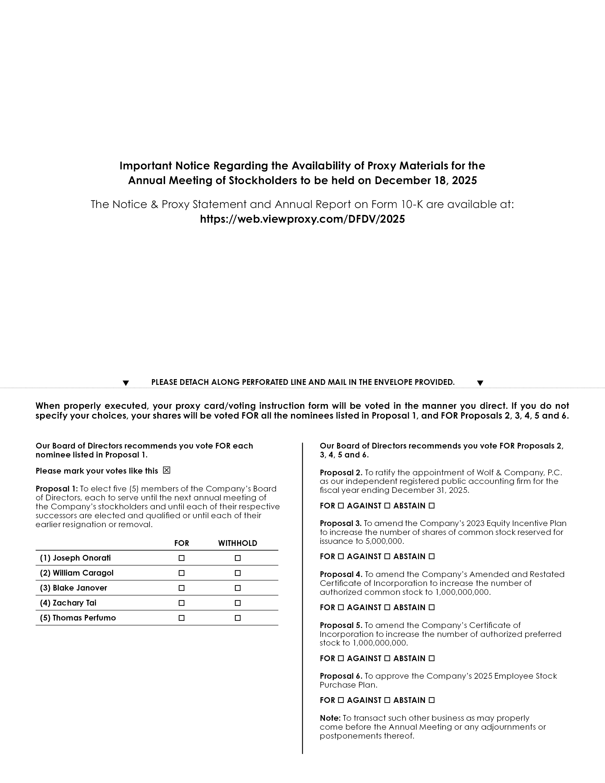 Important Notice Regarding the Availability of Proxy Materials for theAnnual Meeting of Stockholders to be held on December 18, 2025 The Notice & Proxy Statement and Annual Report on Form 10-K are available at:https://web.viewproxy.com/DFDV/2025 PLEASE DETACH ALONG PERFORATED LINE AND MAIL IN THE ENVELOPE PROVIDED. When properly executed, your proxy card/voting instruction form will be voted in the manner you direct. If you do not specify your choices, your shares will be voted FOR all the nominees listed in Proposal 1, and FOR Proposals 2, 3, 4, 5 and 6. Our Board of Directors recommends you vote FOR each nominee listed in Proposal 1. Please mark your votes like this Proposal 1: To elect five (5) members of the Company’s Board of Directors, each to serve until the next annual meeting of the Company’s stockholders and until each of their respective successors are elected and qualified or until each of their earlier resignation or removal. FOR WITHHOLD (1) Joseph Onorati (2) William Caragol (3) Blake Janover (4) Zachary Tai (5) Thomas Perfumo Our Board of Directors recommends you vote FOR Proposals 2, 3, 4, 5 and 6. Proposal 2. To ratify the appointment of Wolf & Company, P.C. as our independent registered public accounting firm for the fiscal year ending December 31, 2025. FOR AGAINST ABSTAIN Proposal 3. To amend the Company’s 2023 Equity Incentive Plan to increase the number of shares of common stock reserved for issuance to 5,000,000. FOR AGAINST ABSTAIN Proposal 4. To amend the Company’s Amended and Restated Certificate of Incorporation to increase the number of authorized common stock to 1,000,000,000. FOR AGAINST ABSTAIN Proposal 5. To amend the Company’s Certificate of Incorporation to increase the number of authorized preferred stock to 1,000,000,000. FOR AGAINST ABSTAIN Proposal 6. To approve the Company’s 2025 Employee Stock Purchase Plan. FOR AGAINST ABSTAIN Note: To transact such other business as may properly come before the Annual Meeting or any adjournments or postponements thereof.