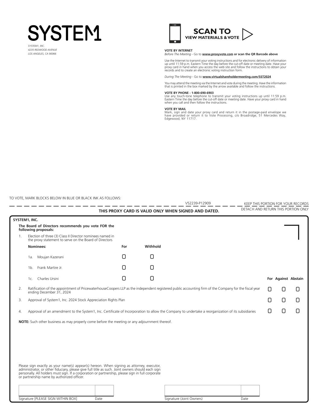 Signature [PLEASE SIGN WITHIN BOX] Date Signature (Joint Owners) Date TO VOTE, MARK BLOCKS BELOW IN BLUE OR BLACK INK AS FOLLOWS: KEEP THIS PORTION FOR YOUR RECORDS DETACH AND RETURN THIS PORTION ONLYTHIS PROXY CARD IS VALID ONLY WHEN SIGNED AND DATED. V52239-P12909 For Withhold For Against Abstain!! !! !! ! !! SYSTEM1, INC. SYSTEM1, INC. 4235 REDWOOD AVENUE LOS ANGELES, CA 90066 Nominees: Please sign exactly as your name(s) appear(s) hereon. When signing as attorney, executor, administrator, or other fiduciary, please give full title as such. Joint owners should each sign personally. All holders must sign. If a corporation or partnership, please sign in full corporate or partnership name by authorized officer. 1a. Moujan Kazerani 1b. Frank Martire Jr. 1c. Charles Ursini 2. Ratification of the appointment of PricewaterhouseCoopers LLP as the independent registered public accounting firm of the Company for the fiscal year ending December 31, 2024 3. Approval of System1, Inc. 2024 Stock Appreciation Rights Plan 4. Approval of an amendment to the System1, Inc. Certificate of Incorporation to allow the Company to undertake a reorganization of its subsidiaries NOTE: Such other business as may properly come before the meeting or any adjournment thereof. 1. Election of three (3) Class II Director nominees named in the proxy statement to serve on the Board of Directors The Board of Directors recommends you vote FOR the following proposals: ! !! ! !! VOTE BY INTERNET Before The Meeting - Go to www.proxyvote.com or scan the QR Barcode above Use the Internet to transmit your voting instructions and for electronic delivery of information up until 11:59 p.m. Eastern Time the day before the cut-off date or meeting date. Have your proxy card in hand when you access the web site and follow the instructions to obtain your records and to create an electronic voting instruction form. During The Meeting - Go to www.virtualshareholdermeeting.com/SST2024 You may attend the meeting via the Internet and vote during the meeting. Have the information that is printed in the box marked by the arrow available and follow the instructions. VOTE BY PHONE - 1-800-690-6903 Use any touch-tone telephone to transmit your voting instructions up until 11:59 p.m. Eastern Time the day before the cut-off date or meeting date. Have your proxy card in hand when you call and then follow the instructions. VOTE BY MAIL Mark, sign and date your proxy card and return it in the postage-paid envelope we have provided or return it to Vote Processing, c/o Broadridge, 51 Mercedes Way, Edgewood, NY 11717. SCAN TO VIEW MATERIALS & VOTEw