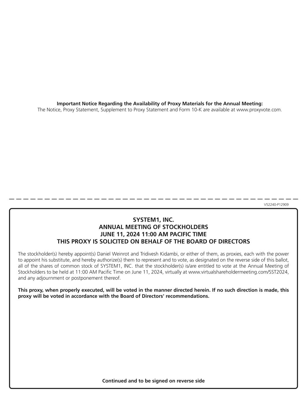 V52240-P12909 Important Notice Regarding the Availability of Proxy Materials for the Annual Meeting: The Notice, Proxy Statement, Supplement to Proxy Statement and Form 10-K are available at www.proxyvote.com. Continued and to be signed on reverse side SYSTEM1, INC. ANNUAL MEETING OF STOCKHOLDERS JUNE 11, 2024 11:00 AM PACIFIC TIME THIS PROXY IS SOLICITED ON BEHALF OF THE BOARD OF DIRECTORS The stockholder(s) hereby appoint(s) Daniel Weinrot and Tridivesh Kidambi, or either of them, as proxies, each with the power to appoint his substitute, and hereby authorize(s) them to represent and to vote, as designated on the reverse side of this ballot, all of the shares of common stock of SYSTEM1, INC. that the stockholder(s) is/are entitled to vote at the Annual Meeting of Stockholders to be held at 11:00 AM Pacific Time on June 11, 2024, virtually at www.virtualshareholdermeeting.com/SST2024, and any adjournment or postponement thereof. This proxy, when properly executed, will be voted in the manner directed herein. If no such direction is made, this proxy will be voted in accordance with the Board of Directors' recommendations.