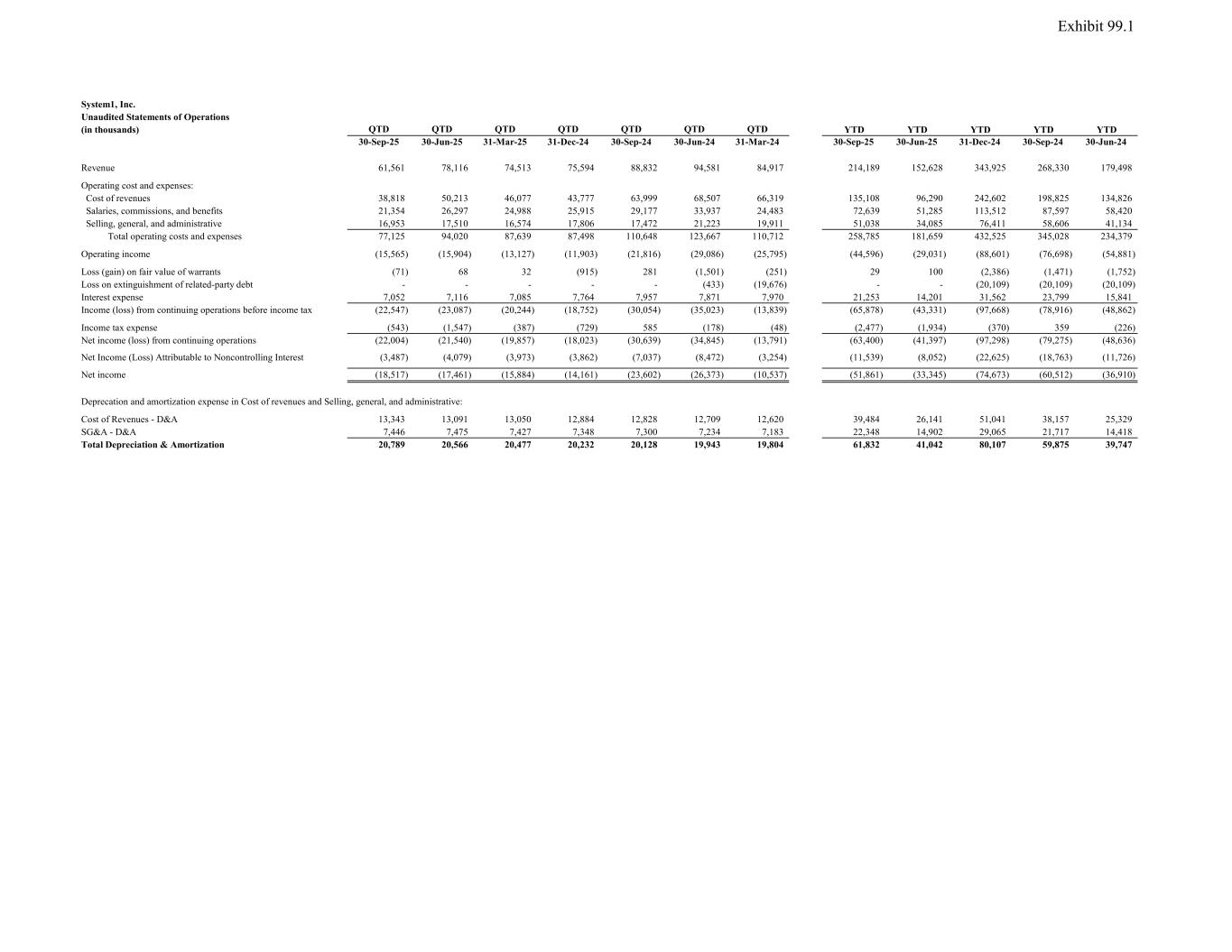 System1, Inc. Unaudited Statements of Operations (in thousands) QTD QTD QTD QTD QTD QTD QTD YTD YTD YTD YTD YTD 30-Sep-25 30-Jun-25 31-Mar-25 31-Dec-24 30-Sep-24 30-Jun-24 31-Mar-24 30-Sep-25 30-Jun-25 31-Dec-24 30-Sep-24 30-Jun-24 Revenue 61,561 78,116 74,513 75,594 88,832 94,581 84,917 214,189 152,628 343,925 268,330 179,498 Operating cost and expenses: Cost of revenues 38,818 50,213 46,077 43,777 63,999 68,507 66,319 135,108 96,290 242,602 198,825 134,826 Salaries, commissions, and benefits 21,354 26,297 24,988 25,915 29,177 33,937 24,483 72,639 51,285 113,512 87,597 58,420 Selling, general, and administrative 16,953 17,510 16,574 17,806 17,472 21,223 19,911 51,038 34,085 76,411 58,606 41,134 Total operating costs and expenses 77,125 94,020 87,639 87,498 110,648 123,667 110,712 258,785 181,659 432,525 345,028 234,379 Operating income (15,565) (15,904) (13,127) (11,903) (21,816) (29,086) (25,795) (44,596) (29,031) (88,601) (76,698) (54,881) - - Loss (gain) on fair value of warrants (71) 68 32 (915) 281 (1,501) (251) 29 100 (2,386) (1,471) (1,752) Loss on extinguishment of related-party debt - - - - - (433) (19,676) - - (20,109) (20,109) (20,109) Interest expense 7,052 7,116 7,085 7,764 7,957 7,871 7,970 21,253 14,201 31,562 23,799 15,841 Income (loss) from continuing operations before income tax (22,547) (23,087) (20,244) (18,752) (30,054) (35,023) (13,839) (65,878) (43,331) (97,668) (78,916) (48,862) Income tax expense (543) (1,547) (387) (729) 585 (178) (48) (2,477) (1,934) (370) 359 (226) Net income (loss) from continuing operations (22,004) (21,540) (19,857) (18,023) (30,639) (34,845) (13,791) (63,400) (41,397) (97,298) (79,275) (48,636) Net Income (Loss) Attributable to Noncontrolling Interest (3,487) (4,079) (3,973) (3,862) (7,037) (8,472) (3,254) (11,539) (8,052) (22,625) (18,763) (11,726) Net income (18,517) (17,461) (15,884) (14,161) (23,602) (26,373) (10,537) (51,861) (33,345) (74,673) (60,512) (36,910) Deprecation and amortization expense in Cost of revenues and Selling, general, and administrative: Cost of Revenues - D&A 13,343 13,091 13,050 12,884 12,828 12,709 12,620 39,484 26,141 51,041 38,157 25,329 SG&A - D&A 7,446 7,475 7,427 7,348 7,300 7,234 7,183 22,348 14,902 29,065 21,717 14,418 Total Depreciation & Amortization 20,789 20,566 20,477 20,232 20,128 19,943 19,804 61,832 41,042 80,107 59,875 39,747