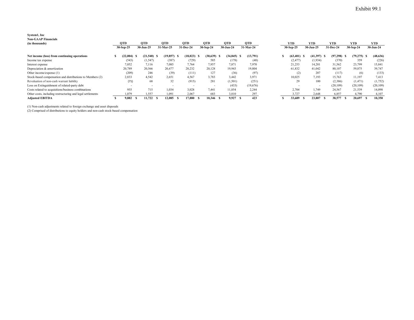 System1, Inc Non-GAAP Financials (in thousands) QTD QTD QTD QTD QTD QTD QTD YTD YTD YTD YTD YTD 30-Sep-25 30-Jun-25 31-Mar-25 31-Dec-24 30-Sep-24 30-Jun-24 31-Mar-24 30-Sep-25 30-Jun-25 31-Dec-24 30-Sep-24 30-Jun-24 Net income (loss) from continuing operations (22,004)$ (21,540)$ (19,857)$ (18,023)$ (30,639)$ (34,845)$ (13,791)$ (63,401)$ (41,397)$ (97,298)$ (79,275)$ (48,636)$ Income tax expense (543) (1,547) (387) (729) 585 (178) (48) (2,477) (1,934) (370) 359 (226) Interest expense 7,052 7,116 7,085 7,764 7,957 7,871 7,970 21,253 14,201 31,562 23,799 15,841 Depreciation & amortization 20,789 20,566 20,477 20,232 20,128 19,943 19,804 61,832 41,042 80,107 59,875 39,747 Other income/expense (1) (209) 246 (39) (111) 127 (36) (97) (2) 207 (117) (6) (133) Stock-based compensation and distributions to Members (2) 2,833 4,542 2,651 4,567 3,783 3,442 3,971 10,025 7,193 15,763 11,197 7,413 Revaluation of non-cash warrant liability (71) 68 32 (915) 281 (1,501) (251) 29 100 (2,386) (1,471) (1,752) Loss on Extinguishment of related-party debt - - - - - (433) (19,676) - - (20,109) (20,109) (20,109) Costs related to acquisitions/business combinations 955 715 1,034 3,028 7,441 11,854 2,244 2,704 1,749 24,567 21,539 14,098 Other costs, including restructuring and legal settlements 1,079 1,557 1,091 2,067 683 3,810 297 3,727 2,648 6,857 4,790 4,107 Adjusted EBITDA 9,882$ 11,722$ 12,085$ 17,880$ 10,346$ 9,927$ 423$ 33,689$ 23,807$ 38,577$ 20,697$ 10,350$ (1) Non-cash adjustments related to foreign exchange and asset disposals (2) Comprised of distributions to equity holders and non-cash stock-based compensation