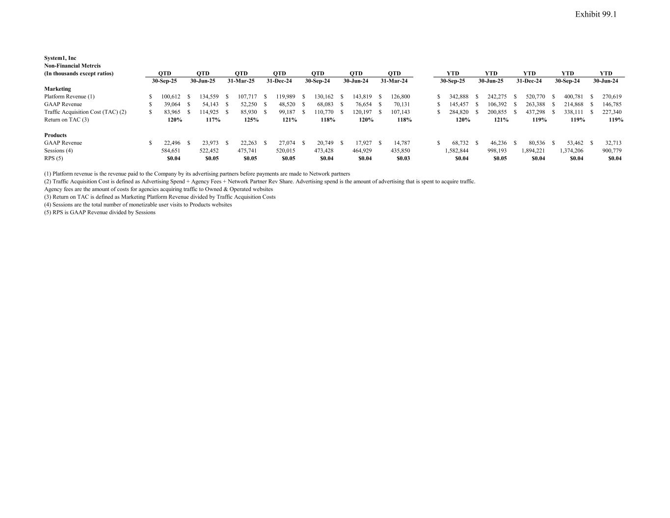 System1, Inc Non-Financial Metrcis (In thousands except ratios) QTD QTD QTD QTD QTD QTD QTD YTD YTD YTD YTD YTD 30-Sep-25 30-Jun-25 31-Mar-25 31-Dec-24 30-Sep-24 30-Jun-24 31-Mar-24 30-Sep-25 30-Jun-25 31-Dec-24 30-Sep-24 30-Jun-24 Marketing Platform Revenue (1) 100,612$ 134,559$ 107,717$ 119,989$ 130,162$ 143,819$ 126,800$ 342,888$ 242,275$ 520,770$ 400,781$ 270,619$ GAAP Revenue 39,064$ 54,143$ 52,250$ 48,520$ 68,083$ 76,654$ 70,131$ 145,457$ 106,392$ 263,388$ 214,868$ 146,785$ Traffic Acquisition Cost (TAC) (2) 83,965$ 114,925$ 85,930$ 99,187$ 110,770$ 120,197$ 107,143$ 284,820$ 200,855$ 437,298$ 338,111$ 227,340$ Return on TAC (3) 120% 117% 125% 121% 118% 120% 118% 120% 121% 119% 119% 119% Products GAAP Revenue 22,496$ 23,973$ 22,263$ 27,074$ 20,749$ 17,927$ 14,787$ 68,732$ 46,236$ 80,536$ 53,462$ 32,713$ Sessions (4) 584,651 522,452 475,741 520,015 473,428 464,929 435,850 1,582,844 998,193 1,894,221 1,374,206 900,779 RPS (5) $0.04 $0.05 $0.05 $0.05 $0.04 $0.04 $0.03 $0.04 $0.05 $0.04 $0.04 $0.04 (1) Platform revenue is the revenue paid to the Company by its advertising partners before payments are made to Network partners (2) Traffic Acquisition Cost is defined as Advertising Spend + Agency Fees + Network Partner Rev Share. Advertising spend is the amount of advertising that is spent to acquire traffic. Agency fees are the amount of costs for agencies acquiring traffic to Owned & Operated websites (3) Return on TAC is defined as Marketing Platform Revenue divided by Traffic Acquisition Costs (4) Sessions are the total number of monetizable user visits to Products websites (5) RPS is GAAP Revenue divided by Sessions