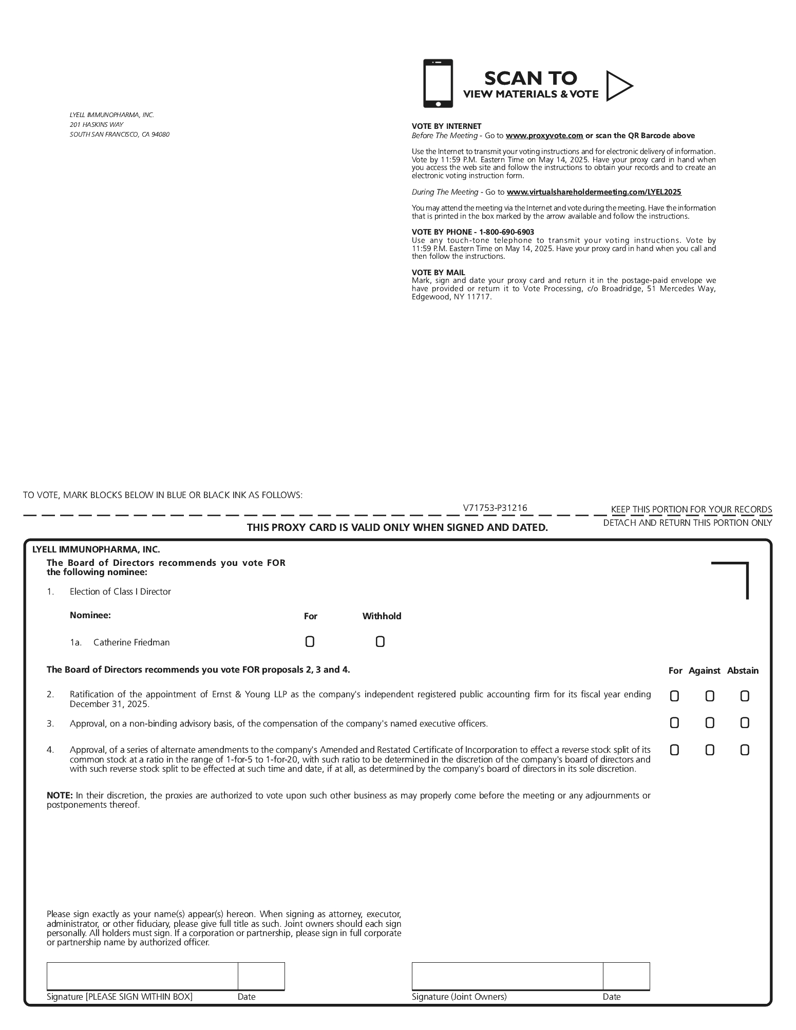 To facilitate stockholder participation in the Annual Meeting, the Annual Meeting this year will be held virtually through a live webcast at www.virtualshareholdermeeting.com/LYEL2025. You will not be able to attend the Annual Meeting in person. If you attend the Annual Meeting online, you will be able to vote and submit questions.