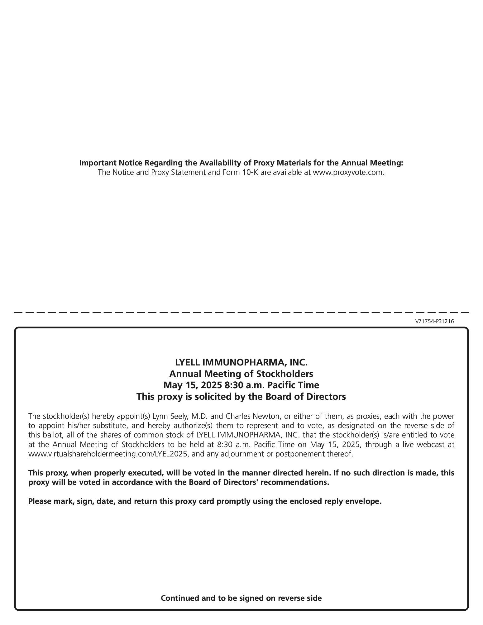 We have sent you these proxy materials because the Board of Directors of Lyell Immunopharma, Inc. (sometimes referred to as the “Company” or “Lyell”) is soliciting your proxy to vote at the 2025 Annual Meeting of Stockholders (the “Annual Meeting”), including at any adjournments or postponements of the meeting. You are invited to attend the Annual Meeting online to vote on the proposals described in this Proxy Statement. However, you do not need to attend the meeting to vote your shares. Instead, you may simply complete, sign and return the enclosed proxy card, or follow the instructions below to submit your proxy over the phone or through the internet.