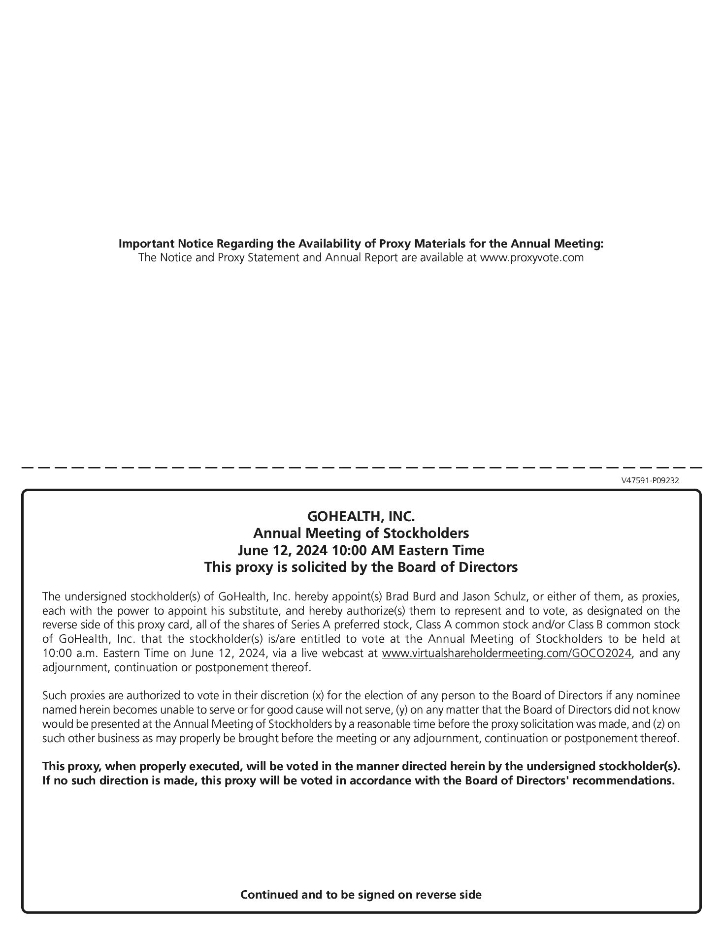 • | by giving written notice of revocation to the Corporate Secretary of GoHealth prior to the Annual Meeting; or |