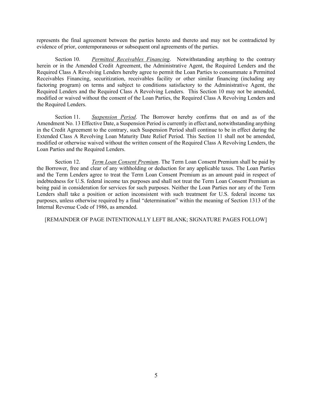 5 represents the final agreement between the parties hereto and thereto and may not be contradicted by evidence of prior, contemporaneous or subsequent oral agreements of the parties. Section 10. Permitted Receivables Financing. Notwithstanding anything to the contrary herein or in the Amended Credit Agreement, the Administrative Agent, the Required Lenders and the Required Class A Revolving Lenders hereby agree to permit the Loan Parties to consummate a Permitted Receivables Financing, securitization, receivables facility or other similar financing (including any factoring program) on terms and subject to conditions satisfactory to the Administrative Agent, the Required Lenders and the Required Class A Revolving Lenders. This Section 10 may not be amended, modified or waived without the consent of the Loan Parties, the Required Class A Revolving Lenders and the Required Lenders. Section 11. Suspension Period. The Borrower hereby confirms that on and as of the Amendment No. 13 Effective Date, a Suspension Period is currently in effect and, notwithstanding anything in the Credit Agreement to the contrary, such Suspension Period shall continue to be in effect during the Extended Class A Revolving Loan Maturity Date Relief Period. This Section 11 shall not be amended, modified or otherwise waived without the written consent of the Required Class A Revolving Lenders, the Loan Parties and the Required Lenders. Section 12. Term Loan Consent Premium. The Term Loan Consent Premium shall be paid by the Borrower, free and clear of any withholding or deduction for any applicable taxes. The Loan Parties and the Term Lenders agree to treat the Term Loan Consent Premium as an amount paid in respect of indebtedness for U.S. federal income tax purposes and shall not treat the Term Loan Consent Premium as being paid in consideration for services for such purposes. Neither the Loan Parties nor any of the Term Lenders shall take a position or action inconsistent with such treatment for U.S. federal income tax purposes, unless otherwise required by a final “determination” within the meaning of Section 1313 of the Internal Revenue Code of 1986, as amended. [REMAINDER OF PAGE INTENTIONALLY LEFT BLANK; SIGNATURE PAGES FOLLOW]