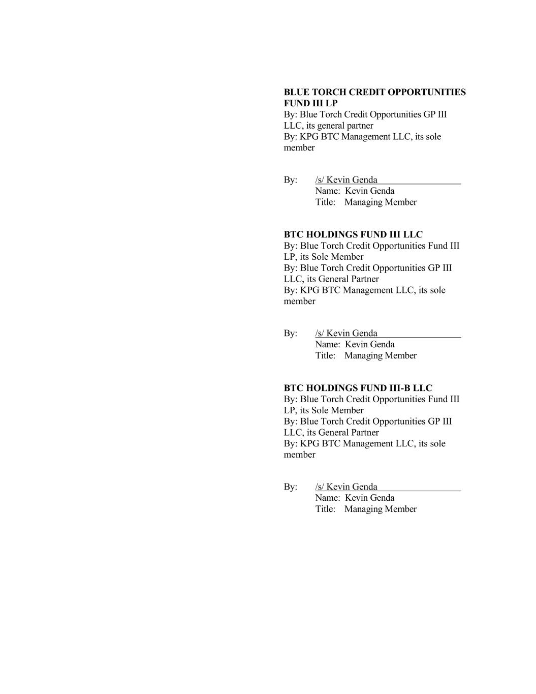 BLUE TORCH CREDIT OPPORTUNITIES FUND III LP By: Blue Torch Credit Opportunities GP III LLC, its general partner By: KPG BTC Management LLC, its sole member By: /s/ Kevin Genda Name: Kevin Genda Title: Managing Member BTC HOLDINGS FUND III LLC By: Blue Torch Credit Opportunities Fund III LP, its Sole Member By: Blue Torch Credit Opportunities GP III LLC, its General Partner By: KPG BTC Management LLC, its sole member By: /s/ Kevin Genda Name: Kevin Genda Title: Managing Member BTC HOLDINGS FUND III-B LLC By: Blue Torch Credit Opportunities Fund III LP, its Sole Member By: Blue Torch Credit Opportunities GP III LLC, its General Partner By: KPG BTC Management LLC, its sole member By: /s/ Kevin Genda Name: Kevin Genda Title: Managing Member
