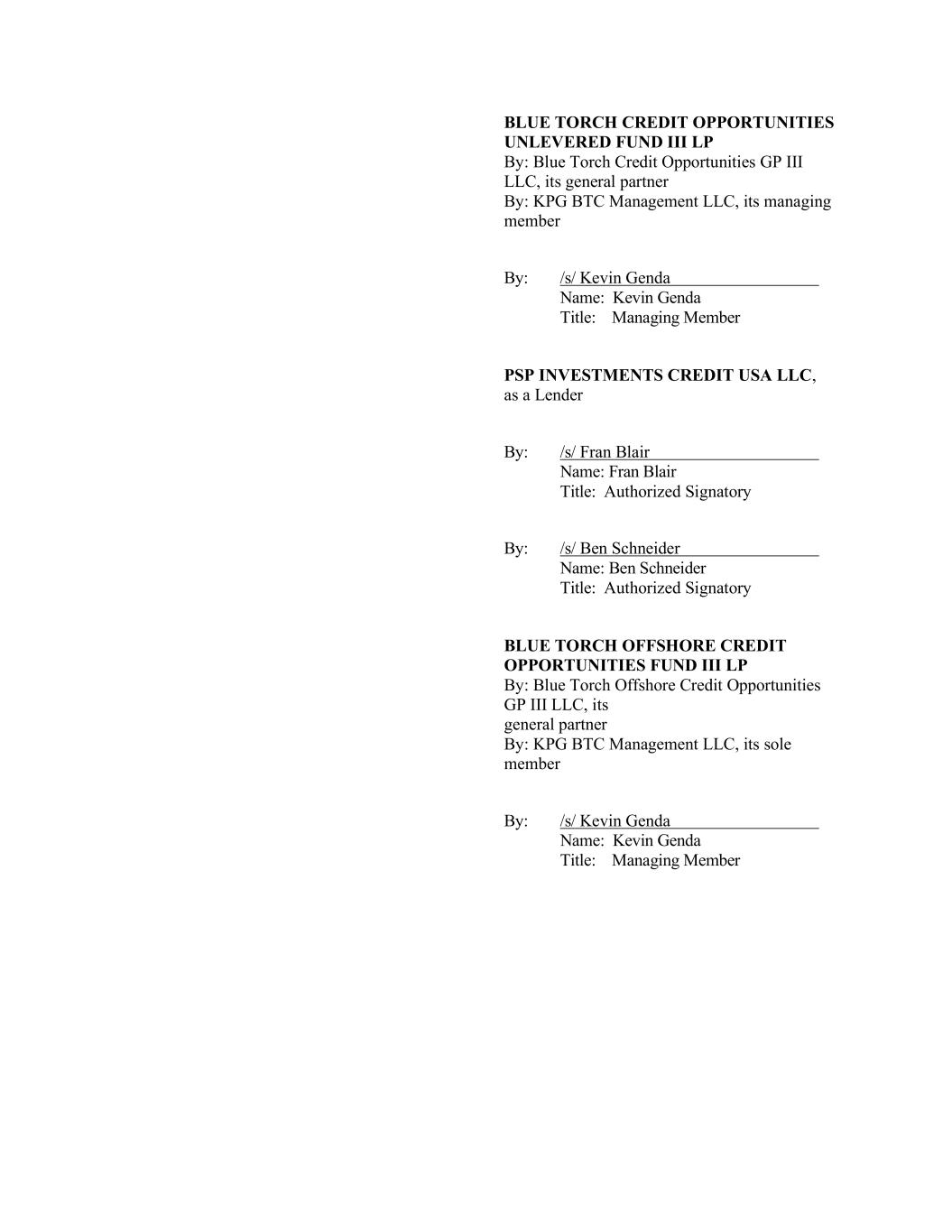 BLUE TORCH CREDIT OPPORTUNITIES UNLEVERED FUND III LP By: Blue Torch Credit Opportunities GP III LLC, its general partner By: KPG BTC Management LLC, its managing member By: /s/ Kevin Genda Name: Kevin Genda Title: Managing Member PSP INVESTMENTS CREDIT USA LLC, as a Lender By: /s/ Fran Blair Name: Fran Blair Title: Authorized Signatory By: /s/ Ben Schneider Name: Ben Schneider Title: Authorized Signatory BLUE TORCH OFFSHORE CREDIT OPPORTUNITIES FUND III LP By: Blue Torch Offshore Credit Opportunities GP III LLC, its general partner By: KPG BTC Management LLC, its sole member By: /s/ Kevin Genda Name: Kevin Genda Title: Managing Member