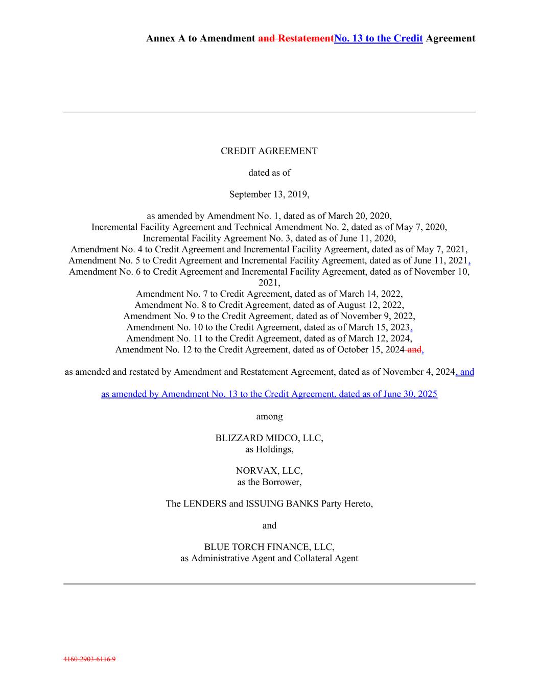 Annex A to Amendment and RestatementNo. 13 to the Credit Agreement 4160-2903-6116.9 CREDIT AGREEMENT dated as of September 13, 2019, as amended by Amendment No. 1, dated as of March 20, 2020, Incremental Facility Agreement and Technical Amendment No. 2, dated as of May 7, 2020, Incremental Facility Agreement No. 3, dated as of June 11, 2020, Amendment No. 4 to Credit Agreement and Incremental Facility Agreement, dated as of May 7, 2021, Amendment No. 5 to Credit Agreement and Incremental Facility Agreement, dated as of June 11, 2021, Amendment No. 6 to Credit Agreement and Incremental Facility Agreement, dated as of November 10, 2021, Amendment No. 7 to Credit Agreement, dated as of March 14, 2022, Amendment No. 8 to Credit Agreement, dated as of August 12, 2022, Amendment No. 9 to the Credit Agreement, dated as of November 9, 2022, Amendment No. 10 to the Credit Agreement, dated as of March 15, 2023, Amendment No. 11 to the Credit Agreement, dated as of March 12, 2024, Amendment No. 12 to the Credit Agreement, dated as of October 15, 2024 and, as amended and restated by Amendment and Restatement Agreement, dated as of November 4, 2024, and as amended by Amendment No. 13 to the Credit Agreement, dated as of June 30, 2025 among BLIZZARD MIDCO, LLC, as Holdings, NORVAX, LLC, as the Borrower, The LENDERS and ISSUING BANKS Party Hereto, and BLUE TORCH FINANCE, LLC, as Administrative Agent and Collateral Agent