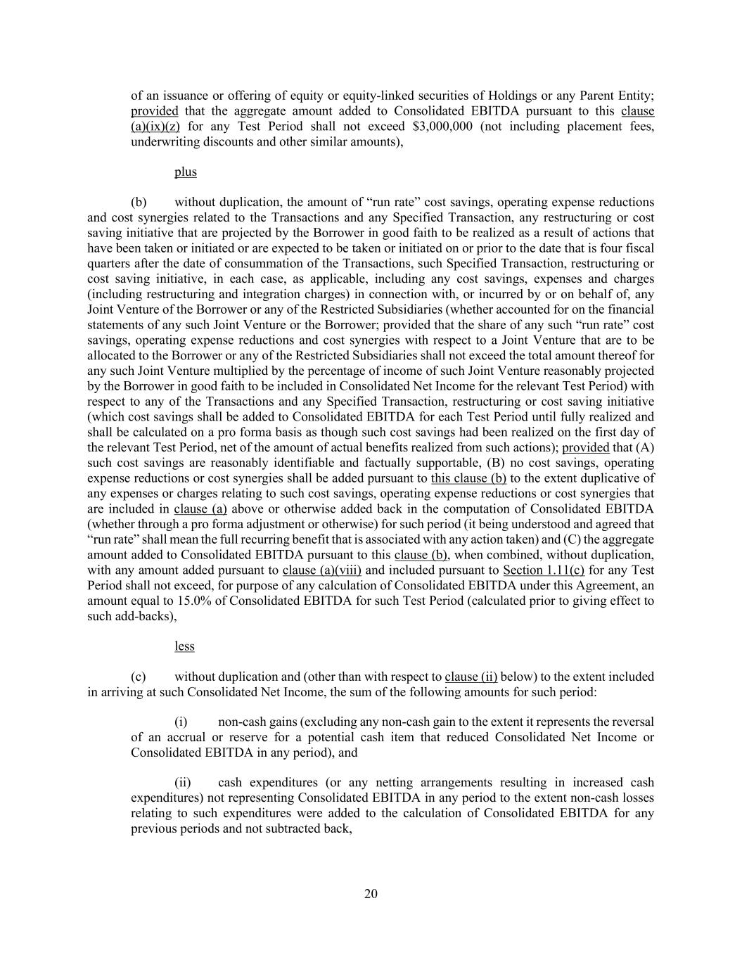 20 of an issuance or offering of equity or equity-linked securities of Holdings or any Parent Entity; provided that the aggregate amount added to Consolidated EBITDA pursuant to this clause (a)(ix)(z) for any Test Period shall not exceed $3,000,000 (not including placement fees, underwriting discounts and other similar amounts), plus (b) without duplication, the amount of “run rate” cost savings, operating expense reductions and cost synergies related to the Transactions and any Specified Transaction, any restructuring or cost saving initiative that are projected by the Borrower in good faith to be realized as a result of actions that have been taken or initiated or are expected to be taken or initiated on or prior to the date that is four fiscal quarters after the date of consummation of the Transactions, such Specified Transaction, restructuring or cost saving initiative, in each case, as applicable, including any cost savings, expenses and charges (including restructuring and integration charges) in connection with, or incurred by or on behalf of, any Joint Venture of the Borrower or any of the Restricted Subsidiaries (whether accounted for on the financial statements of any such Joint Venture or the Borrower; provided that the share of any such “run rate” cost savings, operating expense reductions and cost synergies with respect to a Joint Venture that are to be allocated to the Borrower or any of the Restricted Subsidiaries shall not exceed the total amount thereof for any such Joint Venture multiplied by the percentage of income of such Joint Venture reasonably projected by the Borrower in good faith to be included in Consolidated Net Income for the relevant Test Period) with respect to any of the Transactions and any Specified Transaction, restructuring or cost saving initiative (which cost savings shall be added to Consolidated EBITDA for each Test Period until fully realized and shall be calculated on a pro forma basis as though such cost savings had been realized on the first day of the relevant Test Period, net of the amount of actual benefits realized from such actions); provided that (A) such cost savings are reasonably identifiable and factually supportable, (B) no cost savings, operating expense reductions or cost synergies shall be added pursuant to this clause (b) to the extent duplicative of any expenses or charges relating to such cost savings, operating expense reductions or cost synergies that are included in clause (a) above or otherwise added back in the computation of Consolidated EBITDA (whether through a pro forma adjustment or otherwise) for such period (it being understood and agreed that “run rate” shall mean the full recurring benefit that is associated with any action taken) and (C) the aggregate amount added to Consolidated EBITDA pursuant to this clause (b), when combined, without duplication, with any amount added pursuant to clause (a)(viii) and included pursuant to Section 1.11(c) for any Test Period shall not exceed, for purpose of any calculation of Consolidated EBITDA under this Agreement, an amount equal to 15.0% of Consolidated EBITDA for such Test Period (calculated prior to giving effect to such add-backs), less (c) without duplication and (other than with respect to clause (ii) below) to the extent included in arriving at such Consolidated Net Income, the sum of the following amounts for such period: (i) non-cash gains (excluding any non-cash gain to the extent it represents the reversal of an accrual or reserve for a potential cash item that reduced Consolidated Net Income or Consolidated EBITDA in any period), and (ii) cash expenditures (or any netting arrangements resulting in increased cash expenditures) not representing Consolidated EBITDA in any period to the extent non-cash losses relating to such expenditures were added to the calculation of Consolidated EBITDA for any previous periods and not subtracted back,