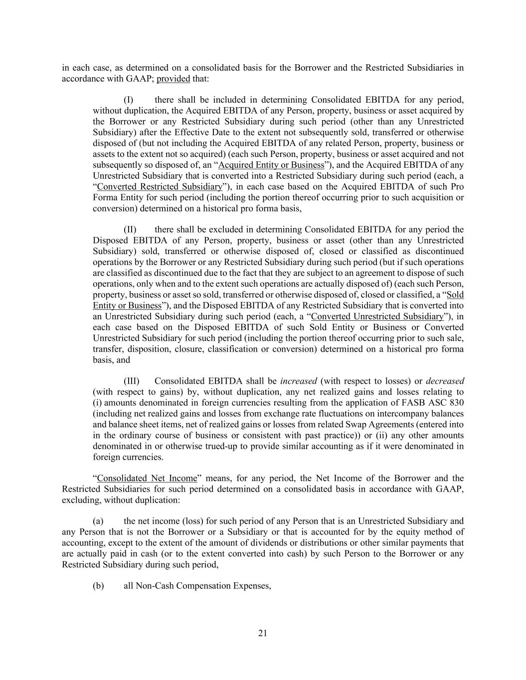 21 in each case, as determined on a consolidated basis for the Borrower and the Restricted Subsidiaries in accordance with GAAP; provided that: (I) there shall be included in determining Consolidated EBITDA for any period, without duplication, the Acquired EBITDA of any Person, property, business or asset acquired by the Borrower or any Restricted Subsidiary during such period (other than any Unrestricted Subsidiary) after the Effective Date to the extent not subsequently sold, transferred or otherwise disposed of (but not including the Acquired EBITDA of any related Person, property, business or assets to the extent not so acquired) (each such Person, property, business or asset acquired and not subsequently so disposed of, an “Acquired Entity or Business”), and the Acquired EBITDA of any Unrestricted Subsidiary that is converted into a Restricted Subsidiary during such period (each, a “Converted Restricted Subsidiary”), in each case based on the Acquired EBITDA of such Pro Forma Entity for such period (including the portion thereof occurring prior to such acquisition or conversion) determined on a historical pro forma basis, (II) there shall be excluded in determining Consolidated EBITDA for any period the Disposed EBITDA of any Person, property, business or asset (other than any Unrestricted Subsidiary) sold, transferred or otherwise disposed of, closed or classified as discontinued operations by the Borrower or any Restricted Subsidiary during such period (but if such operations are classified as discontinued due to the fact that they are subject to an agreement to dispose of such operations, only when and to the extent such operations are actually disposed of) (each such Person, property, business or asset so sold, transferred or otherwise disposed of, closed or classified, a “Sold Entity or Business”), and the Disposed EBITDA of any Restricted Subsidiary that is converted into an Unrestricted Subsidiary during such period (each, a “Converted Unrestricted Subsidiary”), in each case based on the Disposed EBITDA of such Sold Entity or Business or Converted Unrestricted Subsidiary for such period (including the portion thereof occurring prior to such sale, transfer, disposition, closure, classification or conversion) determined on a historical pro forma basis, and (III) Consolidated EBITDA shall be increased (with respect to losses) or decreased (with respect to gains) by, without duplication, any net realized gains and losses relating to (i) amounts denominated in foreign currencies resulting from the application of FASB ASC 830 (including net realized gains and losses from exchange rate fluctuations on intercompany balances and balance sheet items, net of realized gains or losses from related Swap Agreements (entered into in the ordinary course of business or consistent with past practice)) or (ii) any other amounts denominated in or otherwise trued-up to provide similar accounting as if it were denominated in foreign currencies. “Consolidated Net Income” means, for any period, the Net Income of the Borrower and the Restricted Subsidiaries for such period determined on a consolidated basis in accordance with GAAP, excluding, without duplication: (a) the net income (loss) for such period of any Person that is an Unrestricted Subsidiary and any Person that is not the Borrower or a Subsidiary or that is accounted for by the equity method of accounting, except to the extent of the amount of dividends or distributions or other similar payments that are actually paid in cash (or to the extent converted into cash) by such Person to the Borrower or any Restricted Subsidiary during such period, (b) all Non-Cash Compensation Expenses,