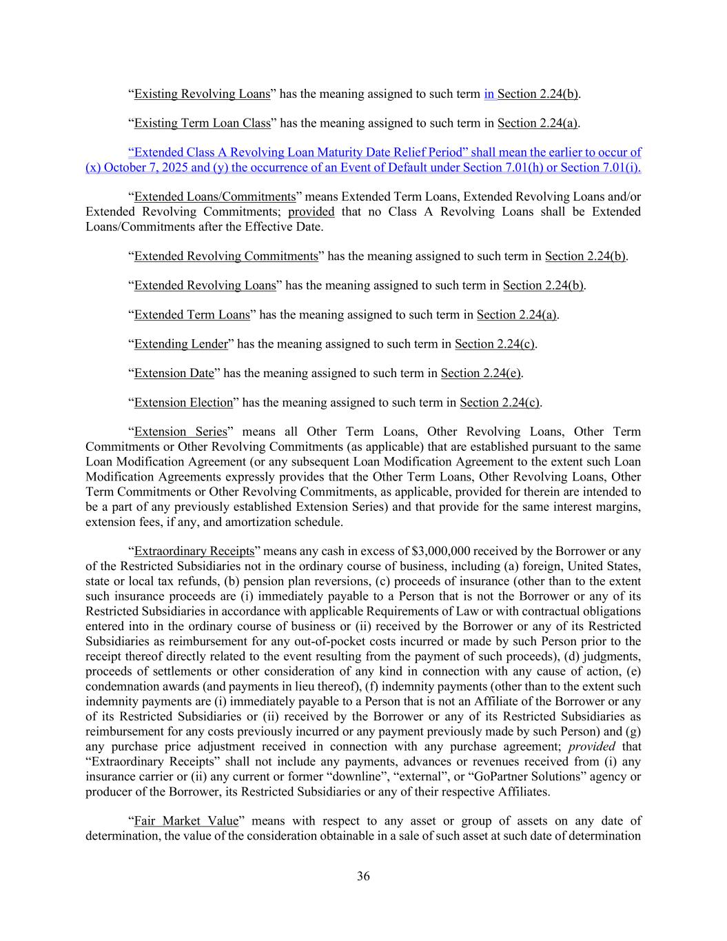 36 “Existing Revolving Loans” has the meaning assigned to such term in Section 2.24(b). “Existing Term Loan Class” has the meaning assigned to such term in Section 2.24(a). “Extended Class A Revolving Loan Maturity Date Relief Period” shall mean the earlier to occur of (x) October 7, 2025 and (y) the occurrence of an Event of Default under Section 7.01(h) or Section 7.01(i). “Extended Loans/Commitments” means Extended Term Loans, Extended Revolving Loans and/or Extended Revolving Commitments; provided that no Class A Revolving Loans shall be Extended Loans/Commitments after the Effective Date. “Extended Revolving Commitments” has the meaning assigned to such term in Section 2.24(b). “Extended Revolving Loans” has the meaning assigned to such term in Section 2.24(b). “Extended Term Loans” has the meaning assigned to such term in Section 2.24(a). “Extending Lender” has the meaning assigned to such term in Section 2.24(c). “Extension Date” has the meaning assigned to such term in Section 2.24(e). “Extension Election” has the meaning assigned to such term in Section 2.24(c). “Extension Series” means all Other Term Loans, Other Revolving Loans, Other Term Commitments or Other Revolving Commitments (as applicable) that are established pursuant to the same Loan Modification Agreement (or any subsequent Loan Modification Agreement to the extent such Loan Modification Agreements expressly provides that the Other Term Loans, Other Revolving Loans, Other Term Commitments or Other Revolving Commitments, as applicable, provided for therein are intended to be a part of any previously established Extension Series) and that provide for the same interest margins, extension fees, if any, and amortization schedule. “Extraordinary Receipts” means any cash in excess of $3,000,000 received by the Borrower or any of the Restricted Subsidiaries not in the ordinary course of business, including (a) foreign, United States, state or local tax refunds, (b) pension plan reversions, (c) proceeds of insurance (other than to the extent such insurance proceeds are (i) immediately payable to a Person that is not the Borrower or any of its Restricted Subsidiaries in accordance with applicable Requirements of Law or with contractual obligations entered into in the ordinary course of business or (ii) received by the Borrower or any of its Restricted Subsidiaries as reimbursement for any out-of-pocket costs incurred or made by such Person prior to the receipt thereof directly related to the event resulting from the payment of such proceeds), (d) judgments, proceeds of settlements or other consideration of any kind in connection with any cause of action, (e) condemnation awards (and payments in lieu thereof), (f) indemnity payments (other than to the extent such indemnity payments are (i) immediately payable to a Person that is not an Affiliate of the Borrower or any of its Restricted Subsidiaries or (ii) received by the Borrower or any of its Restricted Subsidiaries as reimbursement for any costs previously incurred or any payment previously made by such Person) and (g) any purchase price adjustment received in connection with any purchase agreement; provided that “Extraordinary Receipts” shall not include any payments, advances or revenues received from (i) any insurance carrier or (ii) any current or former “downline”, “external”, or “GoPartner Solutions” agency or producer of the Borrower, its Restricted Subsidiaries or any of their respective Affiliates. “Fair Market Value” means with respect to any asset or group of assets on any date of determination, the value of the consideration obtainable in a sale of such asset at such date of determination