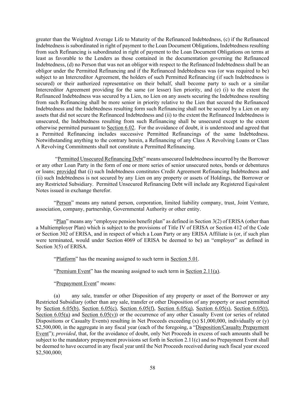 58 greater than the Weighted Average Life to Maturity of the Refinanced Indebtedness, (c) if the Refinanced Indebtedness is subordinated in right of payment to the Loan Document Obligations, Indebtedness resulting from such Refinancing is subordinated in right of payment to the Loan Document Obligations on terms at least as favorable to the Lenders as those contained in the documentation governing the Refinanced Indebtedness, (d) no Person that was not an obligor with respect to the Refinanced Indebtedness shall be an obligor under the Permitted Refinancing and if the Refinanced Indebtedness was (or was required to be) subject to an Intercreditor Agreement, the holders of such Permitted Refinancing (if such Indebtedness is secured) or their authorized representative on their behalf, shall become party to such or a similar Intercreditor Agreement providing for the same (or lesser) lien priority, and (e) (i) to the extent the Refinanced Indebtedness was secured by a Lien, no Lien on any assets securing the Indebtedness resulting from such Refinancing shall be more senior in priority relative to the Lien that secured the Refinanced Indebtedness and the Indebtedness resulting form such Refinancing shall not be secured by a Lien on any assets that did not secure the Refinanced Indebtedness and (ii) to the extent the Refinanced Indebtedness is unsecured, the Indebtedness resulting from such Refinancing shall be unsecured except to the extent otherwise permitted pursuant to Section 6.02. For the avoidance of doubt, it is understood and agreed that a Permitted Refinancing includes successive Permitted Refinancings of the same Indebtedness. Notwithstanding anything to the contrary herein, a Refinancing of any Class A Revolving Loans or Class A Revolving Commitments shall not constitute a Permitted Refinancing. “Permitted Unsecured Refinancing Debt” means unsecured Indebtedness incurred by the Borrower or any other Loan Party in the form of one or more series of senior unsecured notes, bonds or debentures or loans; provided that (i) such Indebtedness constitutes Credit Agreement Refinancing Indebtedness and (ii) such Indebtedness is not secured by any Lien on any property or assets of Holdings, the Borrower or any Restricted Subsidiary. Permitted Unsecured Refinancing Debt will include any Registered Equivalent Notes issued in exchange therefor. “Person” means any natural person, corporation, limited liability company, trust, Joint Venture, association, company, partnership, Governmental Authority or other entity. “Plan” means any “employee pension benefit plan” as defined in Section 3(2) of ERISA (other than a Multiemployer Plan) which is subject to the provisions of Title IV of ERISA or Section 412 of the Code or Section 302 of ERISA, and in respect of which a Loan Party or any ERISA Affiliate is (or, if such plan were terminated, would under Section 4069 of ERISA be deemed to be) an “employer” as defined in Section 3(5) of ERISA. “Platform” has the meaning assigned to such term in Section 5.01. “Premium Event” has the meaning assigned to such term in Section 2.11(a). “Prepayment Event” means: (a) any sale, transfer or other Disposition of any property or asset of the Borrower or any Restricted Subsidiary (other than any sale, transfer or other Disposition of any property or asset permitted by Section 6.05(b), Section 6.05(c), Section 6.05(f), Section 6.05(q), Section 6.05(s), Section 6.05(t), Section 6.05(u) and Section 6.05(v)) or the occurrence of any other Casualty Event (or series of related Dispositions or Casualty Events) resulting in Net Proceeds exceeding (x) $1,000,000, individually or (y) $2,500,000, in the aggregate in any fiscal year (each of the foregoing, a “Disposition/Casualty Prepayment Event”); provided, that, for the avoidance of doubt, only Net Proceeds in excess of such amounts shall be subject to the mandatory prepayment provisions set forth in Section 2.11(c) and no Prepayment Event shall be deemed to have occurred in any fiscal year until the Net Proceeds received during such fiscal year exceed $2,500,000;